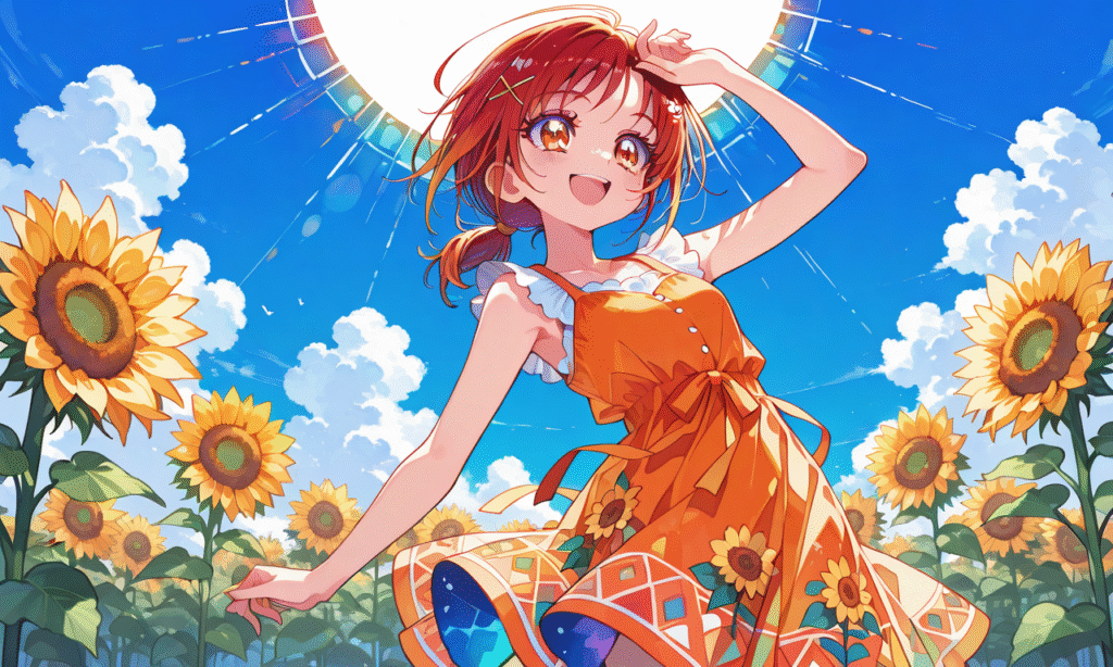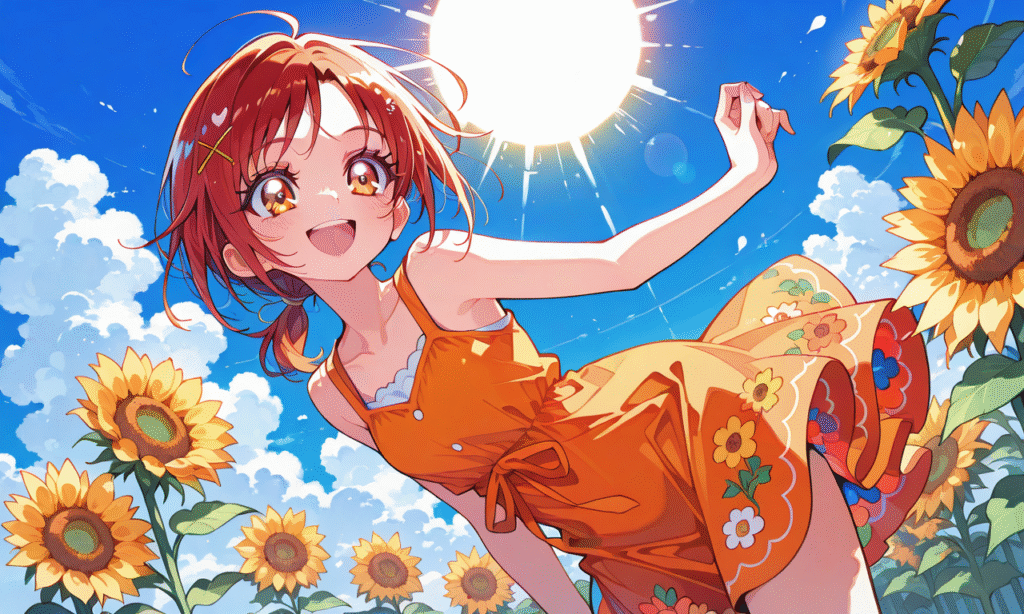 hino akane(precure),short hair, low ponytail, orange eyes, smile,open mouth, orange sundress,sleeveless,summer,blue sky, sunlight, sun,sunflower, masterpiece,high quality, cowboy shot,minimalistic line logo, tessellated geometrical design, symmetrical, vectorized, white background, digital style,colored pencil, colorful flowers,((4k,8k,Ultra HD)),((Masterpiece :1.2)),((Best quality :1.2)),((Detailed :1.5)),((Detailed background :1.5))