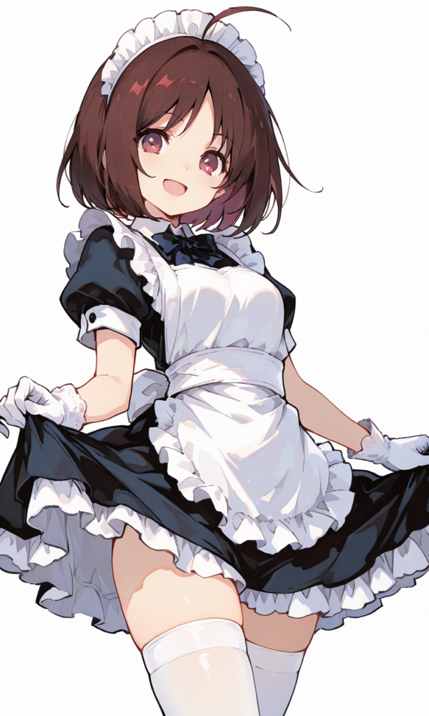 PixAI【Shiitake-Mix】hidaka ai,tsreme,2 ahoge, smile,open mouth,maid,short sleeves, white thighhighs, white gloves, cowboy shot,simplebackground,white background, masterpiece,high quality, ,tokiame,,748cmstyle