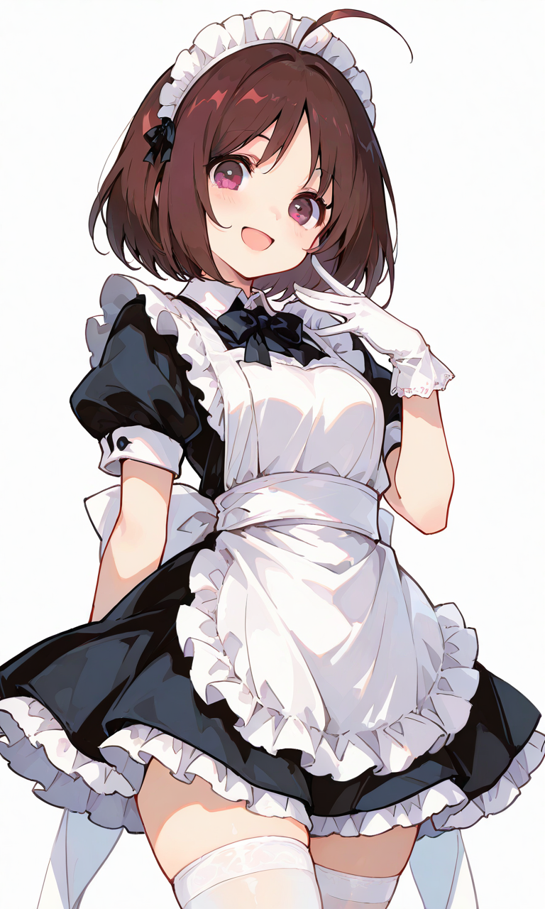 PixAI【Shiitake-Mix】hidaka ai,tsreme,2 ahoge, smile,open mouth,maid,short sleeves, white thighhighs, white gloves, cowboy shot,simplebackground,white background, masterpiece,high quality, ,tokiame,,748cmstyle