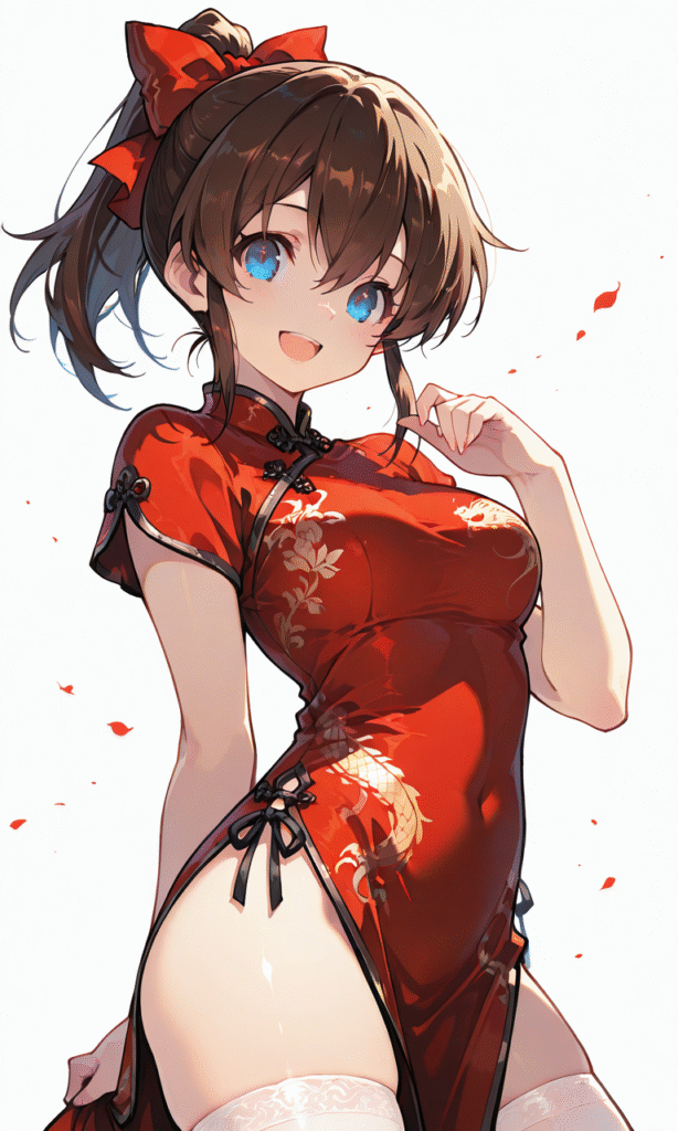 satake minako, red china dress, white thighhighs, smile, open mouth, cowboy shot, simple background, white background, masterpiece, high quality, high resolution, tokiame, hyper-detailed, high contrast, depth of field, ray tracing, best lighting, cinematic composition, beautiful face, beautiful eyes, sharp focus, (masterpiece:1.2), (best quality:1.2), (very aesthetic:1.2), (absurdres:1.2), (detailed background)