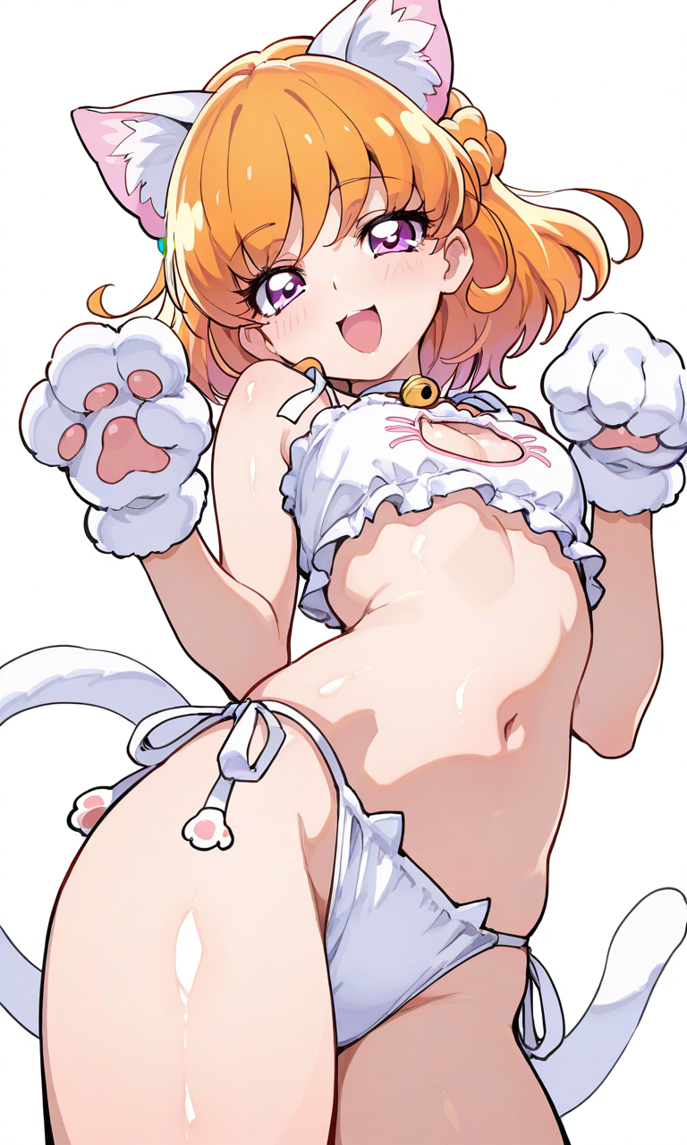 PixAI【Shiitake-Mix】asahina mirai(precure),white cat lingerie,cat hands,lucky cat pose,open mouth, smile,cowboy shot,from below, simplebackground,white background, masterpiece,high quality, ,tokiame,shiny skin, shiny,Anime, moe