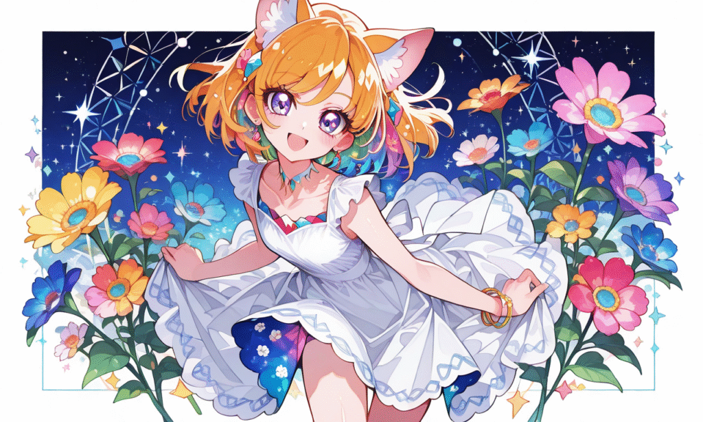 asahina mirai(precure),solo,cat ears,white sundress,smile,open mouth, jewelry, diamond,ruby,sapphire,topaz,night sky,looking at viewer,cowboy shot ,skipping, masterpiece,high quality, ,minimalistic line logo, tessellated geometrical design, symmetrical, vectorized, white background, digital style,colored pencil, colorful flowers,shiny skin, shiny,Anime, moe