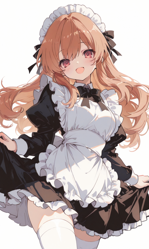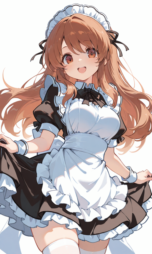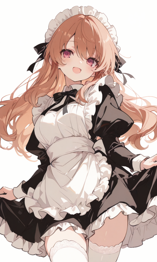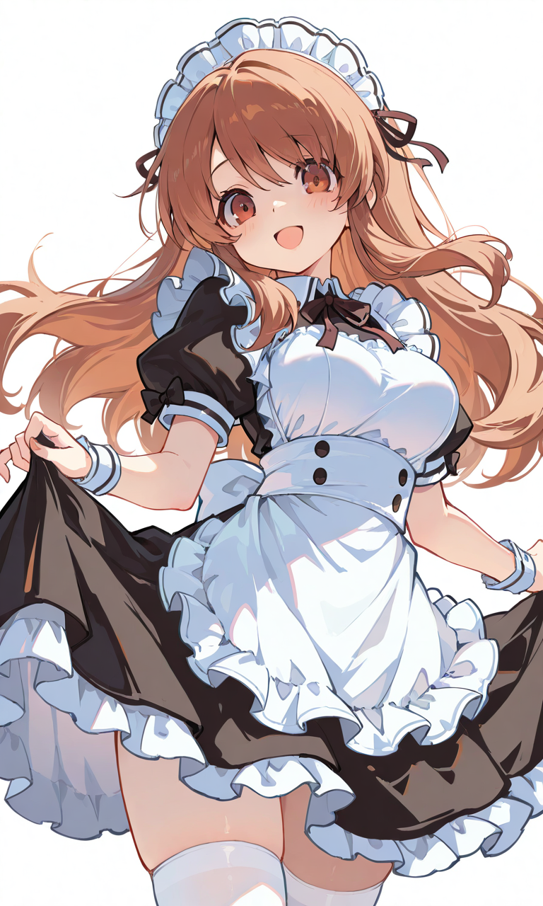 asahina mikuru,maid,white thighhighs, smile,open mouth, cowboy shot,simplebackground,white background, masterpiece,high quality, ,tokiame,NineV,Flat color, anime screencap,748cmstyle,Anime, moe,hyper-detailed, high contrast, depth of field, ray tracing, best lighting, cinematic composition, beautiful face, beautiful eyes, sharp focus, (masterpiece:1.2), (best quality:1.2), (very aesthetic:1.2), (absurdres:1.2), (detailed background),