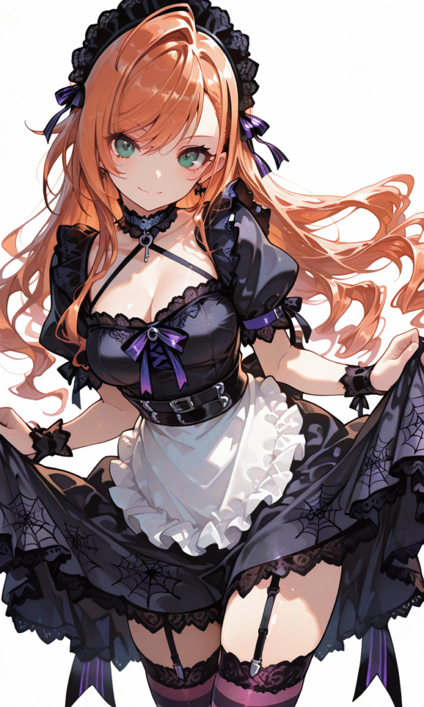 arisugawa natsuha,green eyes, dark navy lace gothic maid costume, spiderweb patterns skirt, white apron, dark navy bat-shaped ribbon, purple striped stockings, garter belt,key choker, lace and ribbons, cowboy shot,simplebackground,white background, masterpiece,high quality, high resolution,tokiame,shiny skin, shiny,hyper-detailed, high contrast, depth of field, ray tracing, best lighting, cinematic composition, beautiful face, beautiful eyes, sharp focus, (masterpiece:1.2), (best quality:1.2), (very aesthetic:1.2), (absurdres:1.2), (detailed background),