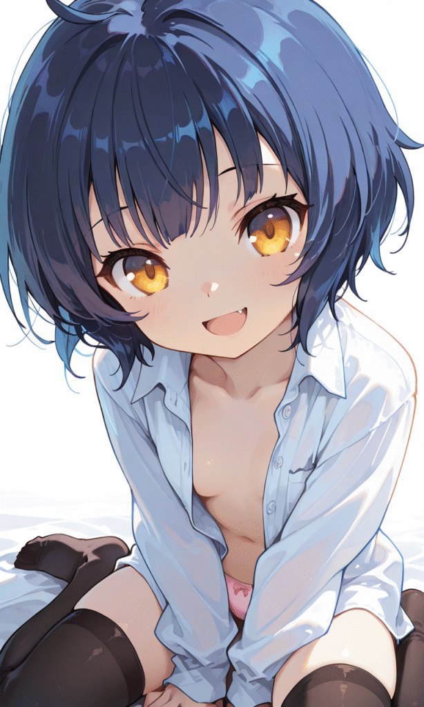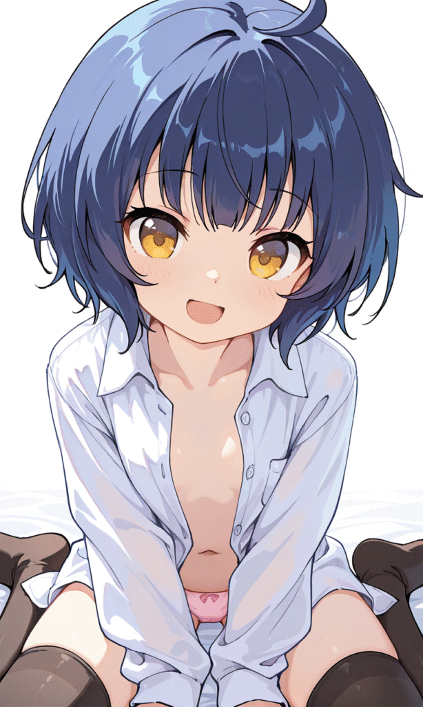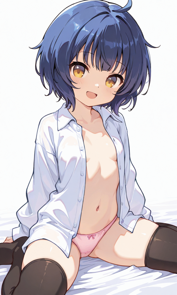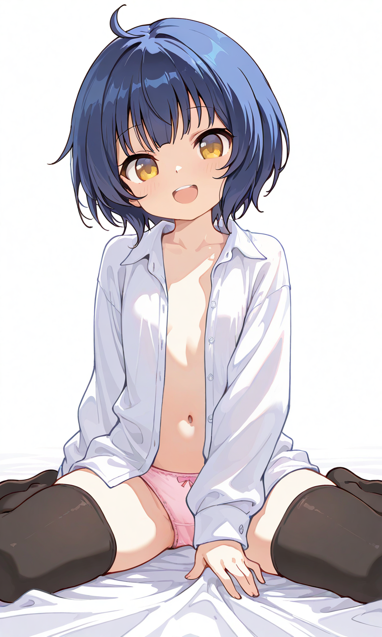 PixAI【Shiitake-Mix】jouga maya, loli,solo,white dress shirt,open clothes,black thighhighs,pink panties,wariza,looking at viewer, smile,open mouth, cowboy shot,sheet,simplebackground,white background, masterpiece,high quality, high resolution,tokiame,hyper-detailed, high contrast, depth of field, ray tracing, best lighting, cinematic composition, beautiful face, beautiful eyes, sharp focus, (masterpiece:1.2), (best quality:1.2), (very aesthetic:1.2), (absurdres:1.2), (detailed background),