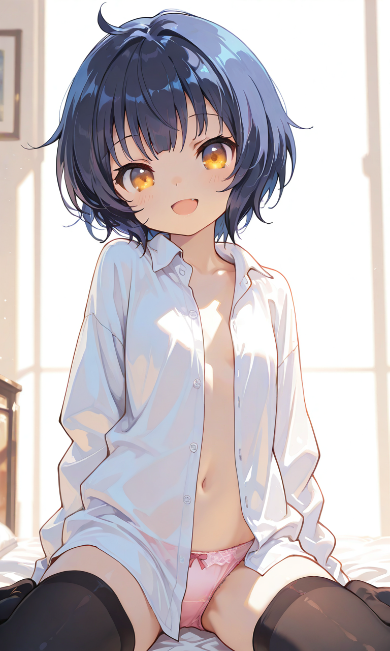 PixAI【Shiitake-Mix】jouga maya, loli,solo,white dress shirt,open clothes,black thighhighs,pink panties,wariza,looking at viewer, smile,open mouth, cowboy shot,sheet,simplebackground,white background, masterpiece,high quality, high resolution,tokiame,hyper-detailed, high contrast, depth of field, ray tracing, best lighting, cinematic composition, beautiful face, beautiful eyes, sharp focus, (masterpiece:1.2), (best quality:1.2), (very aesthetic:1.2), (absurdres:1.2), (detailed background),