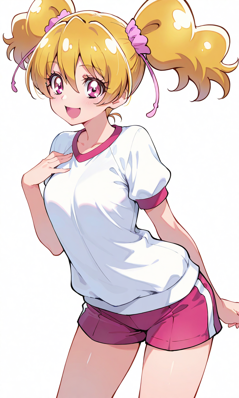 momozono love(precure), gym uniform,red buruma, smile,open mouth,looking at viewer, cowboy shot,simplebackground,white background, masterpiece,high quality, ,tokiame