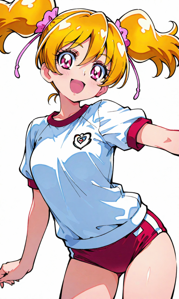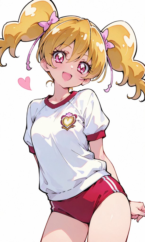 momozono love(precure), gym uniform,red buruma, smile,open mouth,looking at viewer, cowboy shot,simplebackground,white background, masterpiece,high quality, ,tokiame,748cmstyle