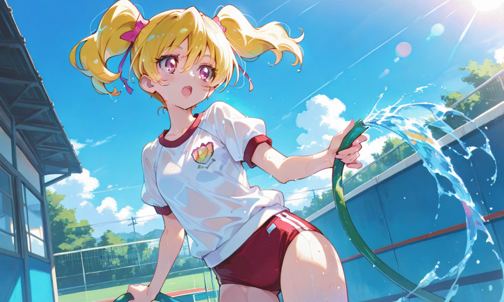 PixAI【Shiitake-Mix】momozono love(precure), gym uniform,red buruma, one eye closed, open mouth,holding hose,wet,summer,blue sky, heavy lens flare, cowboy shot,masterpiece,high quality, ,cinematic lighting , cinematic angle, soft light , color detail, backlighting, Depth of field, long exposure, light steps, intricate colors, vibrant colors,tokiame,748cmstyle,cinematic lighting , cinematic angle, soft light , color detail, backlighting, Depth of field, long exposure, light steps, intricate colors, vibrant colors,((4k,8k,Ultra HD)),((Masterpiece :1.2)),((Best quality :1.2)),((Detailed :1.5)),((Detailed background :1.5))