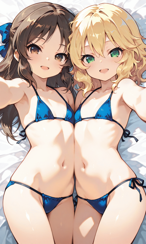 PixAI【Shiitake-Mix】2girls, sakurai momoka, tachibana arisu, white microbikini, flat chest, lying, looking at viewer, smile, open mouth, shoulder-to-shoulder, straight-on, bed sheet, cowboy shot, ((simplebackground)), white background, masterpiece, high quality, high resolution, hyper-detailed, high contrast, depth of field, ray tracing, best lighting, cinematic composition, beautiful face, beautiful eyes, sharp focus, (masterpiece:1.2), (best quality:1.2), (very aesthetic:1.2), (absurdres:1.2), (detailed background), tokiame, hyper-detailed, high contrast, depth of field, ray tracing, best lighting, cinematic composition, beautiful face, beautiful eyes, sharp focus, (masterpiece:1.2), (best quality:1.2), (very aesthetic:1.2), (absurdres:1.2), (detailed background), tokiame
