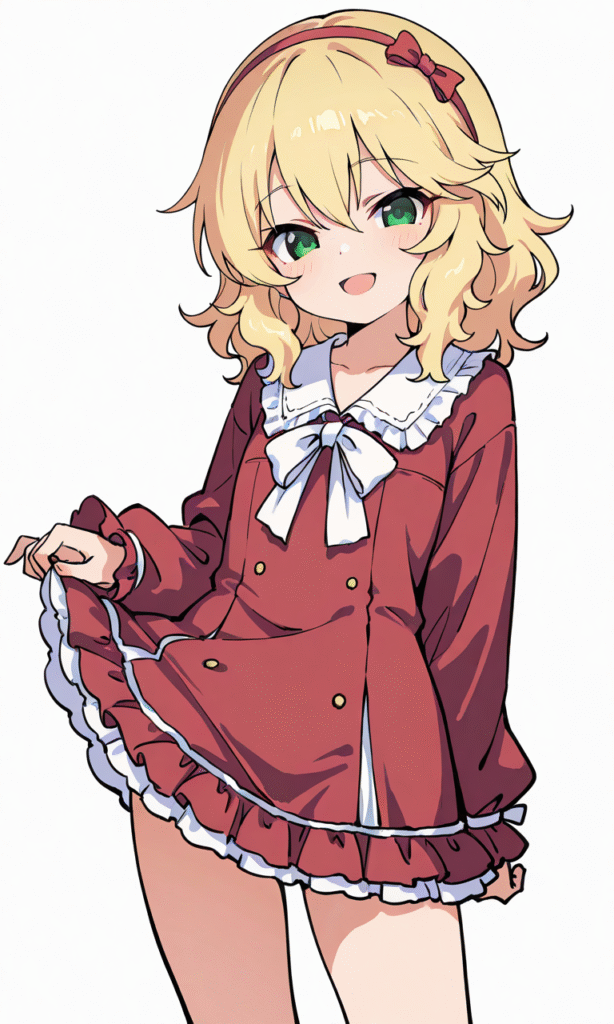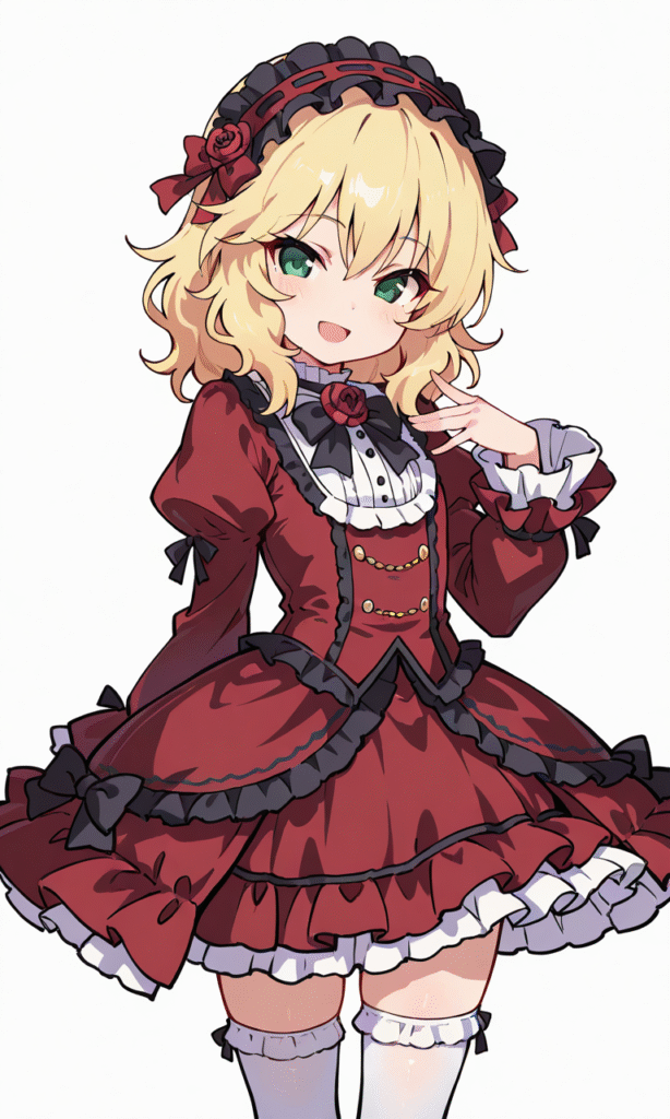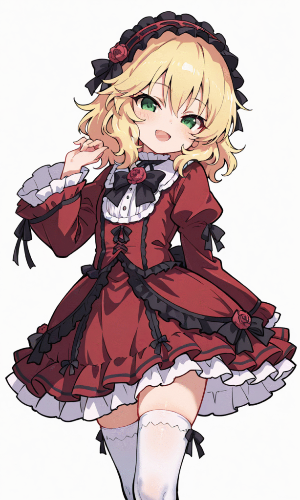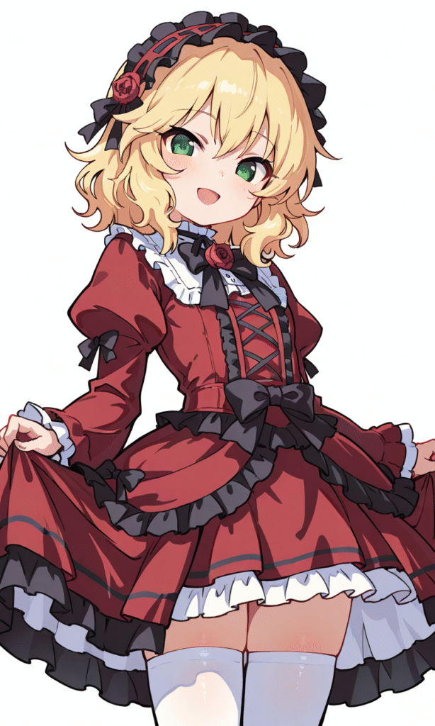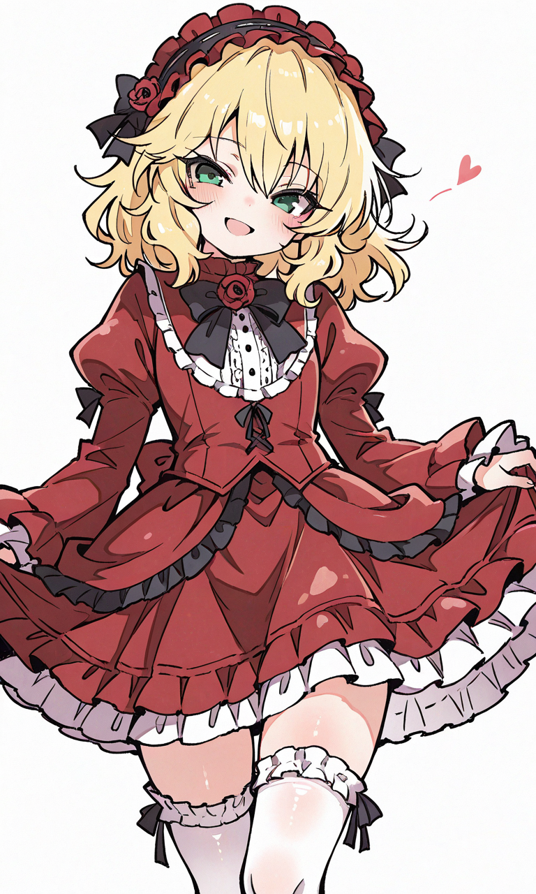 PixAI【Shiitake-Mix】sakurai momoka, smile,open mouth,red Gothic Lolita, white thighhighs, cowboy shot,simplebackground,white background, masterpiece,high quality, high resolution