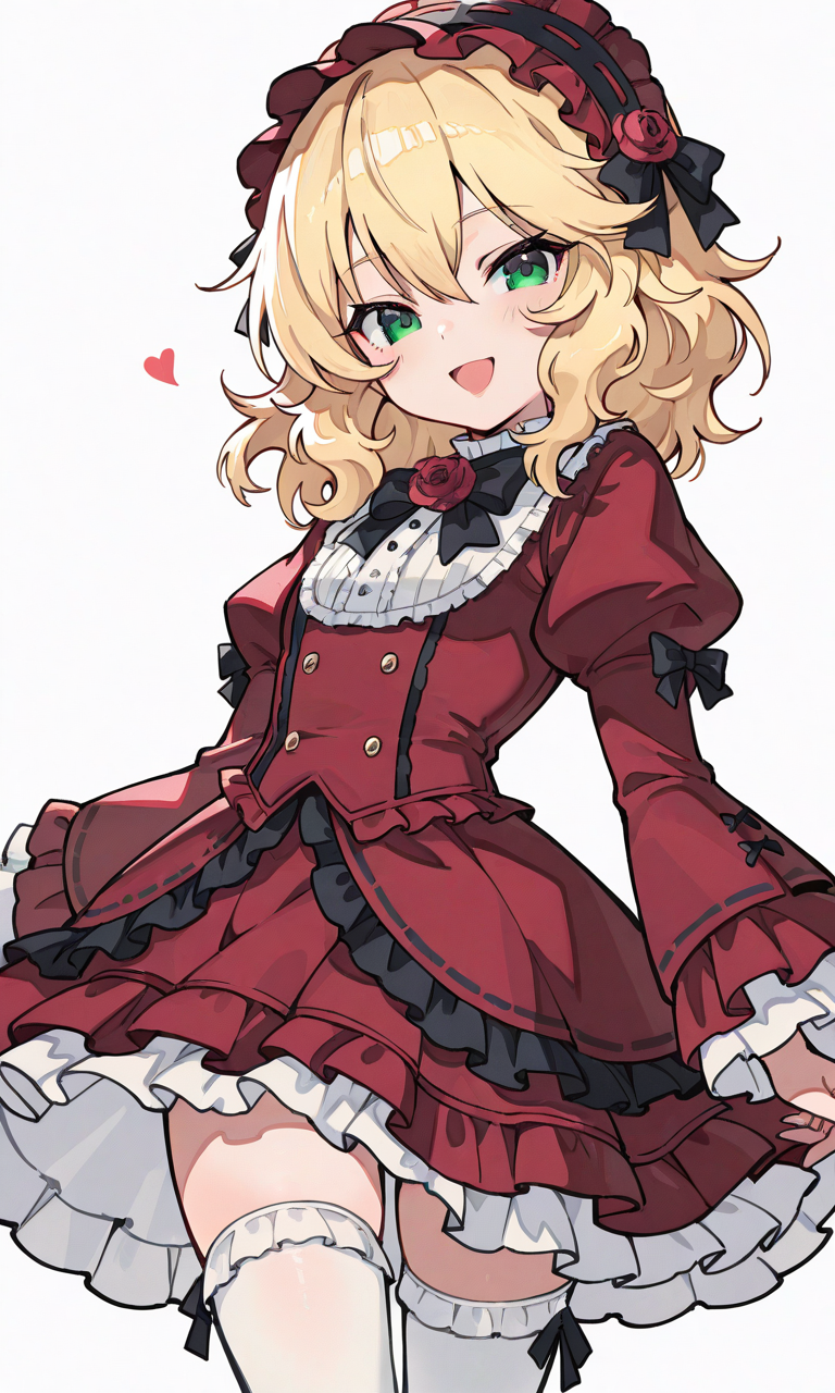 PixAI【Shiitake-Mix】sakurai momoka, smile,open mouth,red Gothic Lolita, white thighhighs, cowboy shot,simplebackground,white background, masterpiece,high quality, high resolution