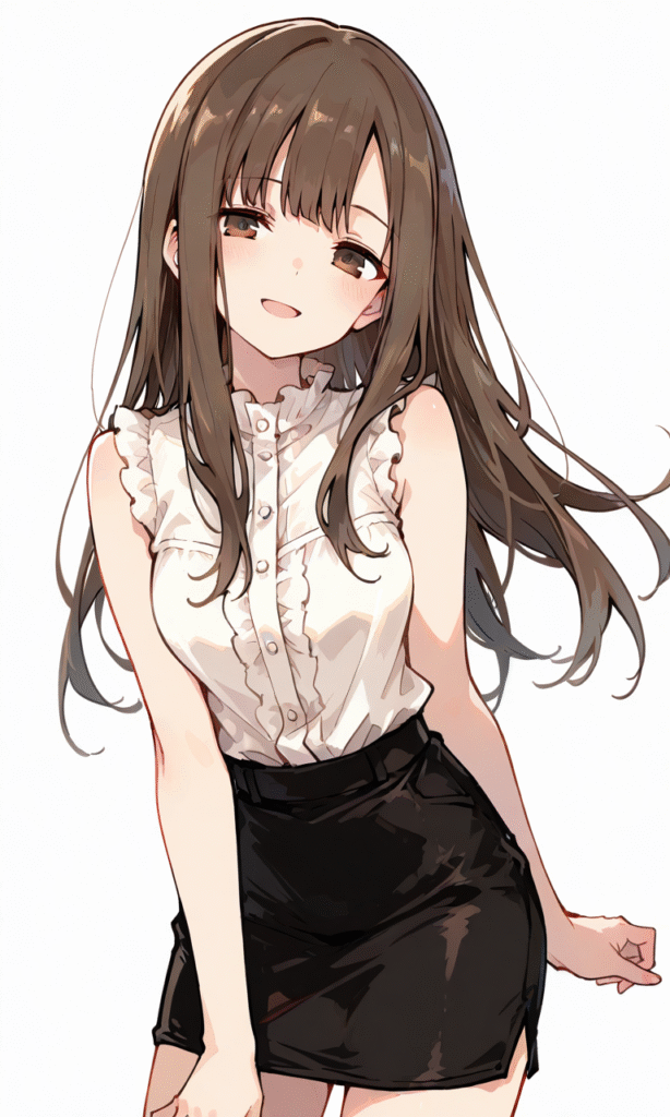 PixAI【Shiitake-Mix】mizumoto yukari, smile,open mouth,blouse, sleeveless,pencil skirt, cowboy shot,simplebackground,white background, masterpiece,high quality, high resolution