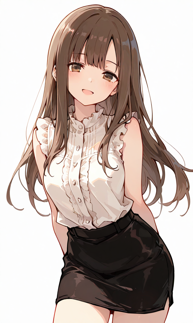 PixAI【Shiitake-Mix】mizumoto yukari, smile,open mouth,blouse, sleeveless,pencil skirt, cowboy shot,simplebackground,white background, masterpiece,high quality, high resolution