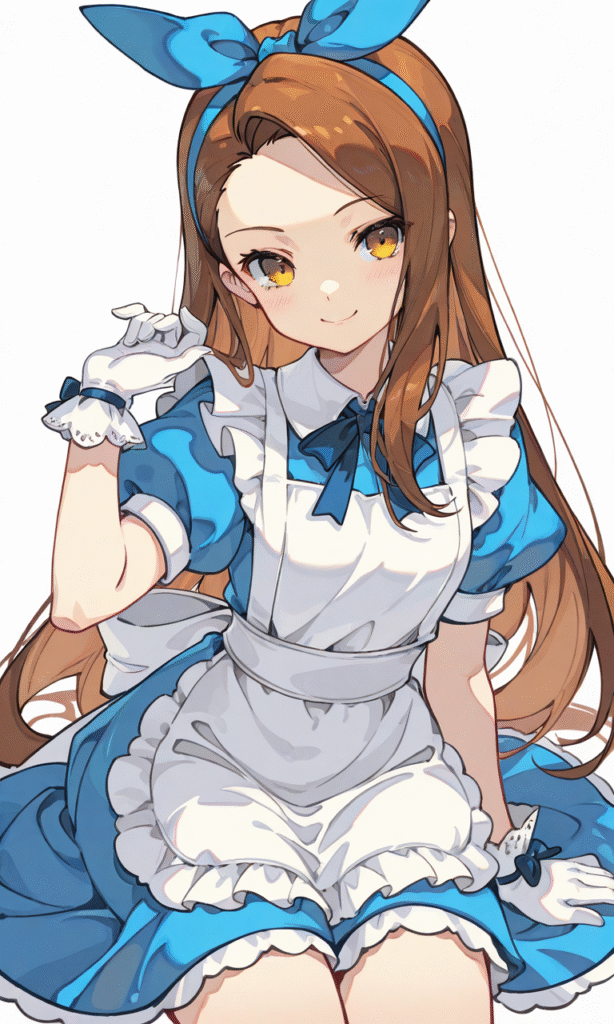 PixAI【Shiitake-Mix】minase iori,solo,yellow eyes, (blue hairribbon),white glove,white socks,sitting, alice (alice in wonderland) (cosplay),legs together, smile,open mouth,head tilt, cowboy shot,looking at viewer, simplebackground,white background, masterpiece,high quality, ,tokiame,z3zz4