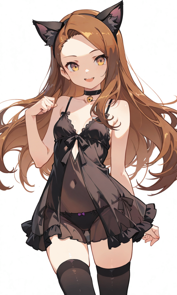 minase iori,yellow eyes, black babydoll,black thighhighs, cat ears,black choker, smile,open mouth, cowboy shot,simplebackground,white background, masterpiece,high quality, ,tokiame,NineV