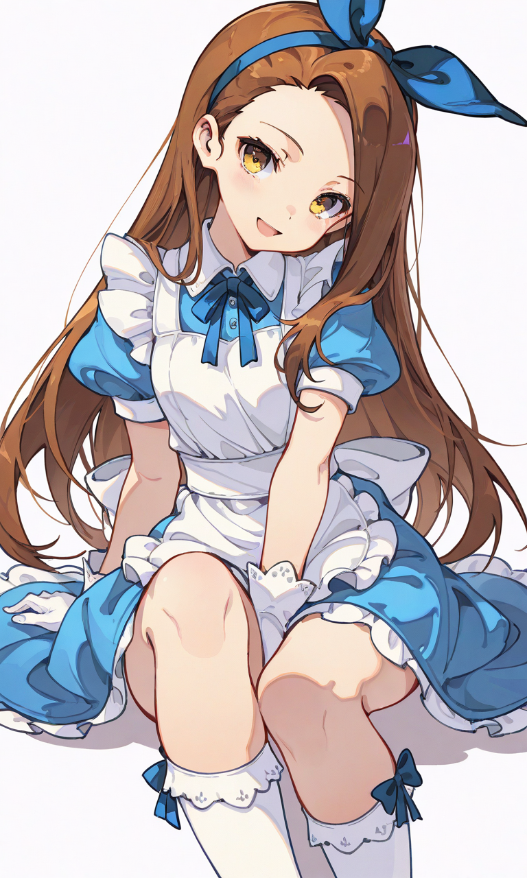 PixAI【Shiitake-Mix】minase iori,solo,yellow eyes, (blue hairribbon),white glove,white socks,sitting, alice (alice in wonderland) (cosplay),legs together, smile,open mouth,head tilt, cowboy shot,looking at viewer, simplebackground,white background, masterpiece,high quality, ,tokiame,z3zz4
