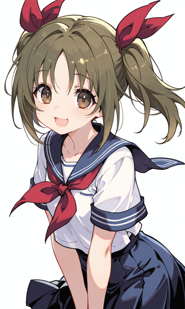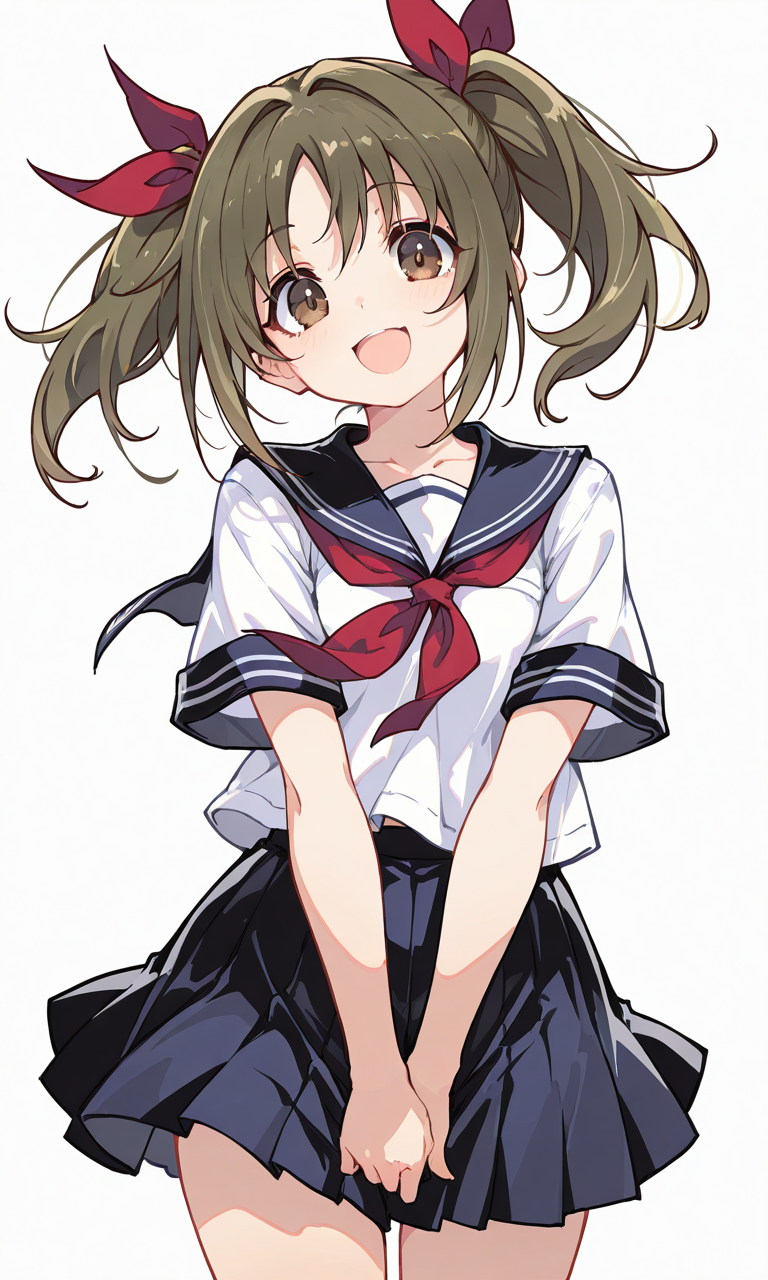 imai kana,brown eyes, serafuku, short sleeves,red hairribbon smile,open mouth, cowboy shot,simplebackground,white background, masterpiece,high quality,