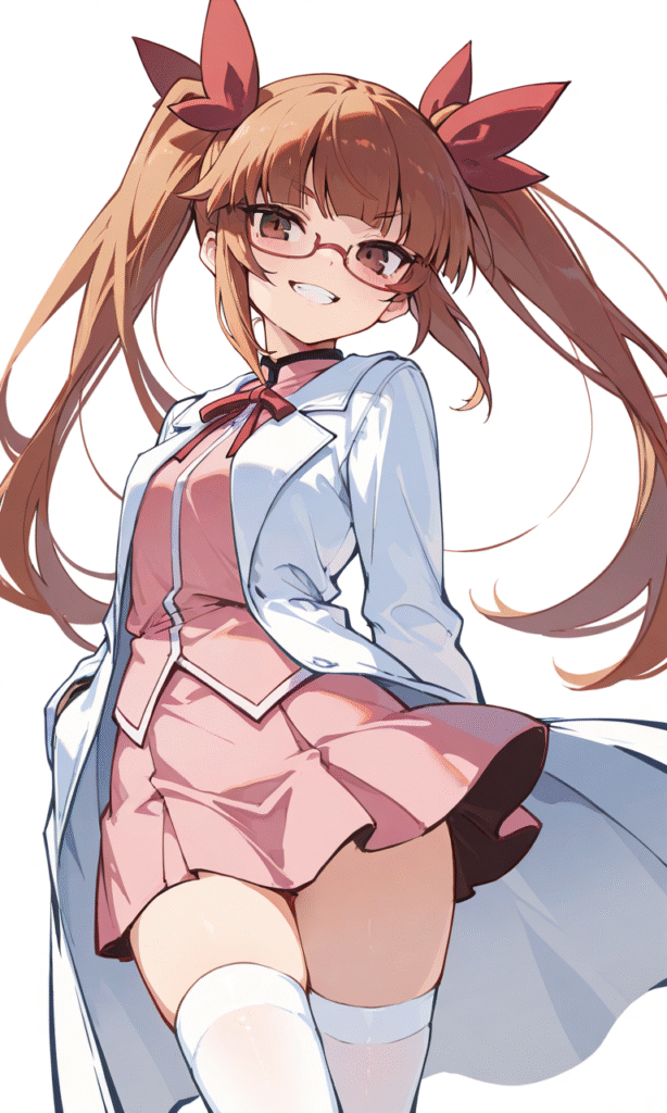 PixAI【Shiitake-Mix】ikebukuro akiha,red glasses,white coat, pink dress,miniskirt,white thighhighs, grin, cowboy shot,simplebackground,white background, masterpiece,high quality,