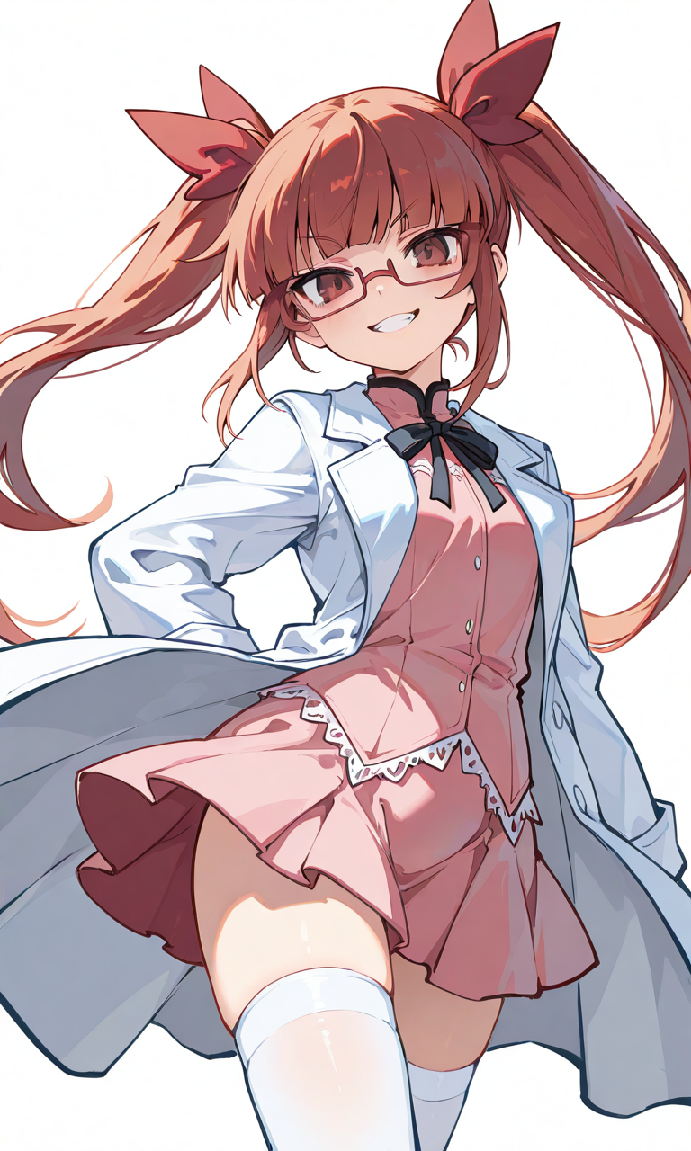 PixAI【Shiitake-Mix】ikebukuro akiha,red glasses,white coat, pink dress,miniskirt,white thighhighs, grin, cowboy shot,simplebackground,white background, masterpiece,high quality,