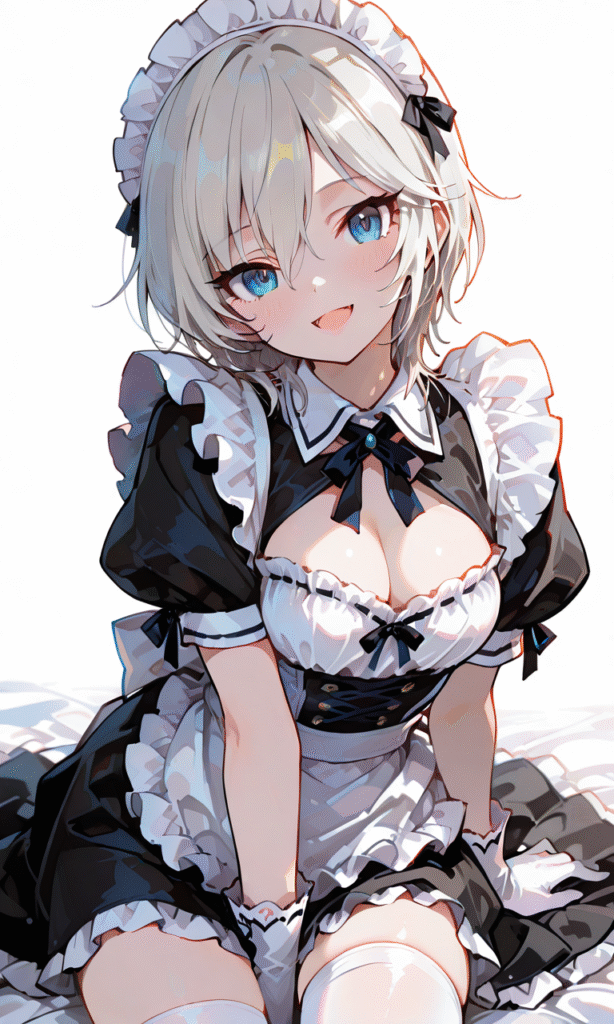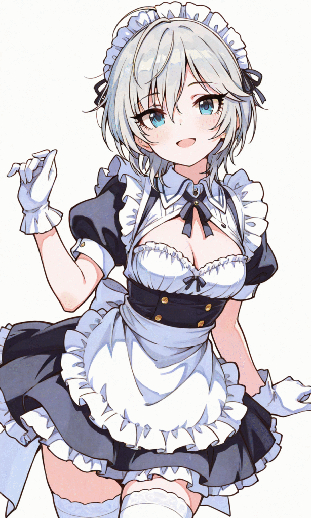 anastasia (idolmaster),maid,open chest,white gloves, white thighhighs, smile,open mouth, cowboy shot,simplebackground,white background, masterpiece,high quality, high resolution