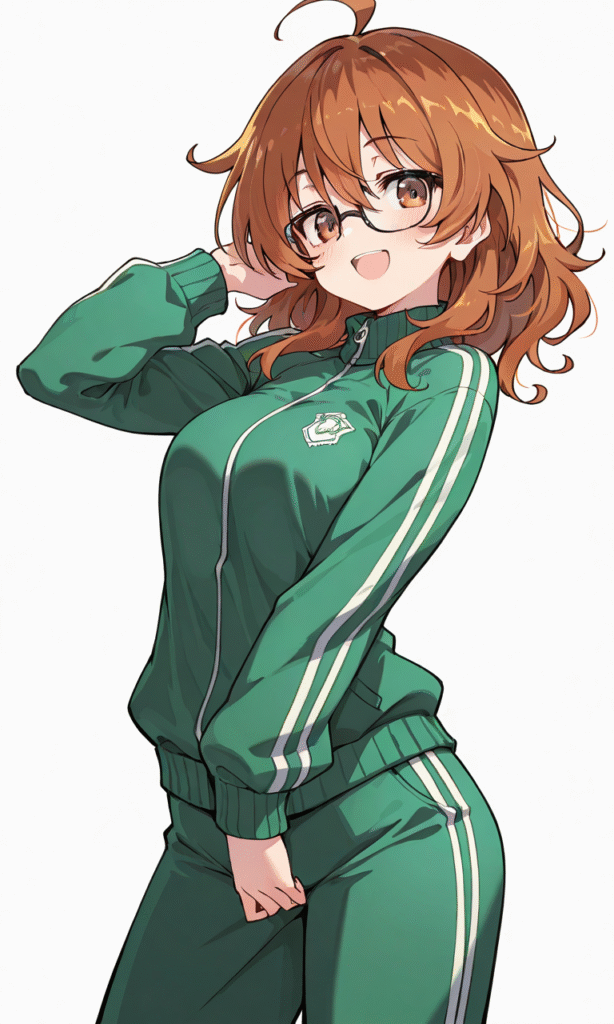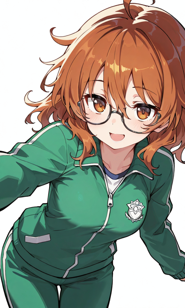 araki hina,glasses, smile,open mouth,green track suit, cowboy shot,simplebackground,white background, masterpiece,high quality, high resolution