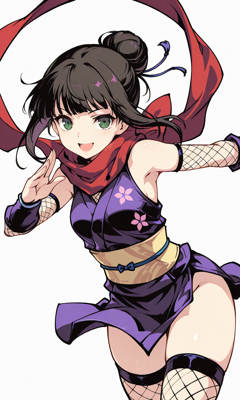 PixAI【Shiitake-Mix】hamaguchi ayame,single hair bun,,purple kunoichi,red scarf, fishnet thighhighs,dynamic pose, smile,open mouth, cowboy shot,simplebackground,white background, masterpiece,high quality, high resolution,,tokiame