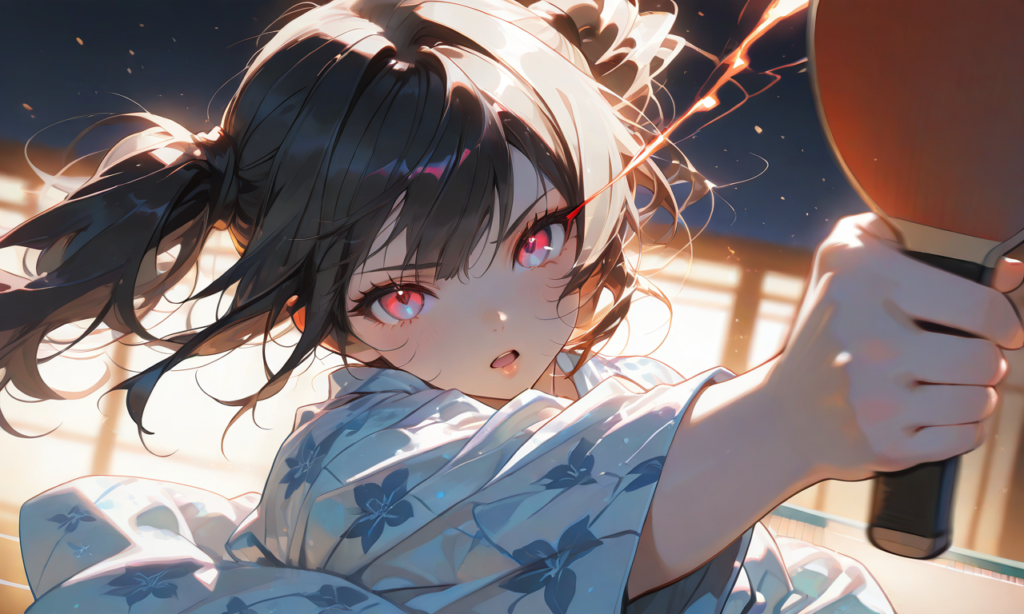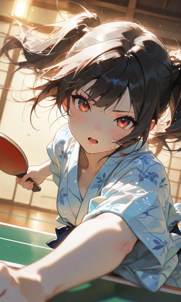 girl,black hair, twintails,bath yukata, table tennis paddle, serious, open mouth, upper body, spread arm, motion blur,looking at viewer, dutch angle, masterpiece,high resolution,high quality, ,high-res,♡masterpiece, highest quality, ♡,hyper-detailed, high contrast, depth of field, ray tracing, best lighting, cinematic composition, beautiful face, beautiful eyes, sharp focus, (masterpiece:1.2), (best quality:1.2), (very aesthetic:1.2), (absurdres:1.2), (detailed background),