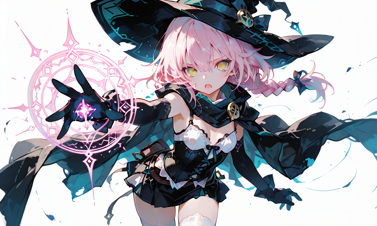 PixAI【Shiitake-Mix】1girl, light pink hair, single braid, yellow eyes, witch, black elbow gloves, scarf, cloak, bustier, small breasts, white miniskirt, long boots, white thighhighs, serious expression, open mouth, outstretched arm, magic circle, incoming attack, cowboy shot, looking at viewer, masterpiece, high quality, hyper-detailed, high contrast, depth of field, ray tracing, best lighting, cinematic composition, beautiful face, beautiful eyes, sharp focus, (masterpiece:1.2), (best quality:1.2), (very aesthetic:1.2), (absurdres:1.2), detailed background, tokiame, fantasy scene, 748cmstyle