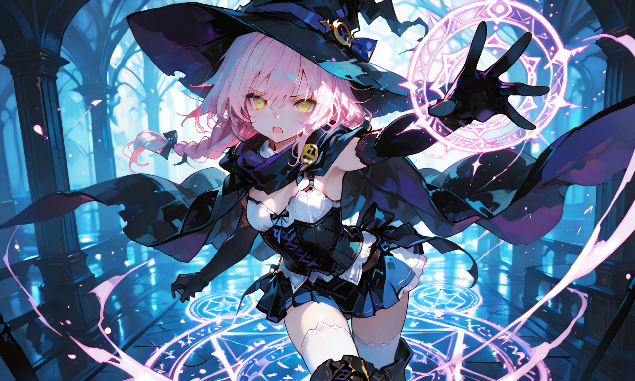 PixAI【Shiitake-Mix】1girl, light pink hair, single braid, yellow eyes, witch, black elbow gloves, scarf, cloak, bustier, small breasts, white miniskirt, long boots, white thighhighs, serious expression, open mouth, outstretched arm, magic circle, incoming attack, cowboy shot, looking at viewer, masterpiece, high quality, hyper-detailed, high contrast, depth of field, ray tracing, best lighting, cinematic composition, beautiful face, beautiful eyes, sharp focus, (masterpiece:1.2), (best quality:1.2), (very aesthetic:1.2), (absurdres:1.2), detailed background, tokiame, fantasy scene, 748cmstyle