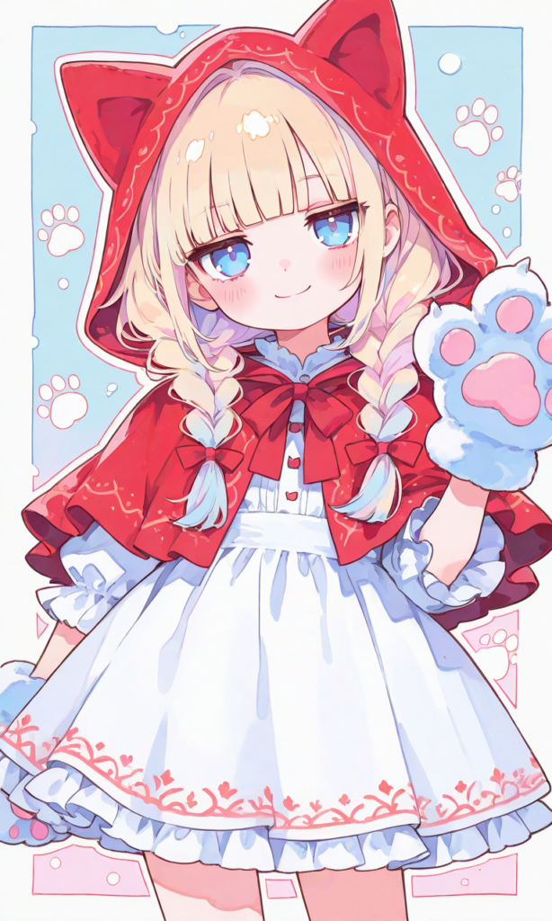 PixAI【Shiitake-Mix】1girl, Grimms’ Fairy Tales, colored lineart, colored outline, chibi, little girl, (((solo))), blonde hair, twin braids, blunt bangs, jitome, cat ears hood, red hood, (((kigurumi))), looking at viewer, smile, cowboy shot, cat paws background, masterpiece, high quality, high resolution, high-res, watercolor, sketch style, watercolor effect, pastel colors