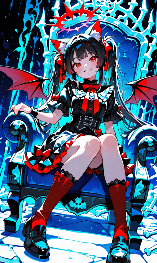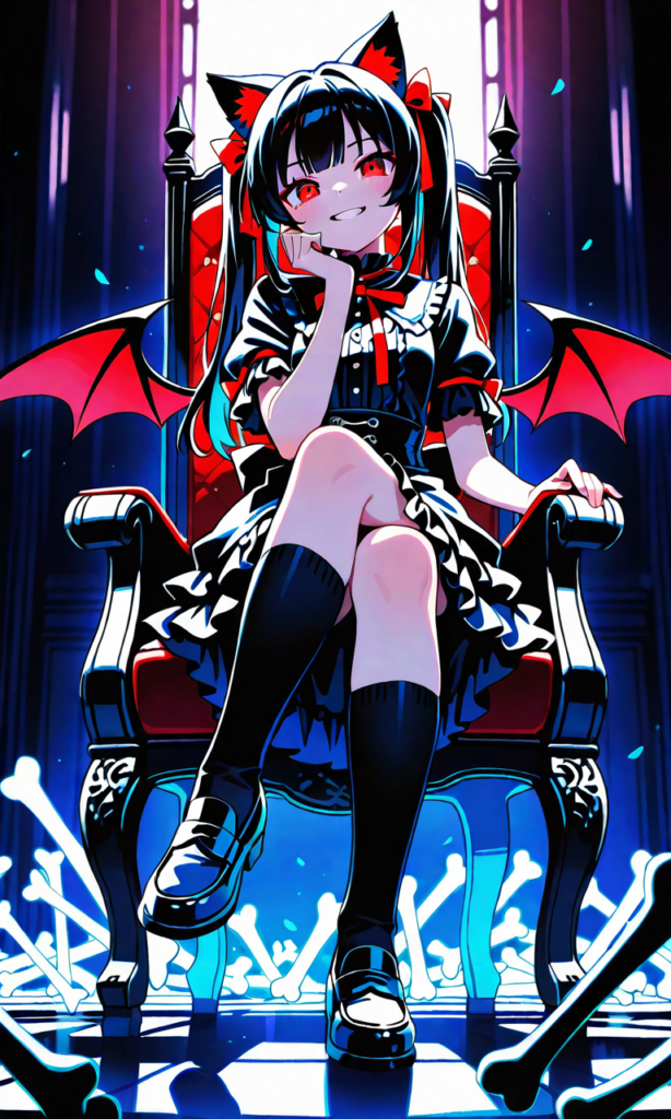 PixAI【Shiitake-Mix】itre girl,solo,black hair,twintails, cat ears,red eyes,red hairribbon,full body, devil wings, Gothic Lolita, short sleeves,socks, loafers, grin,sitting on throne, Bone Chair, masterpiece, high quality, high resolution.,high-res,cinematic lighting , cinematic angle, soft light , color detail, backlighting, Depth of field, long exposure, light steps, intricate colors, vibrant colors,♡masterpiece, highest quality, ♡