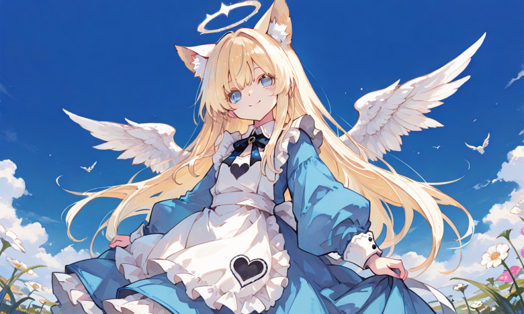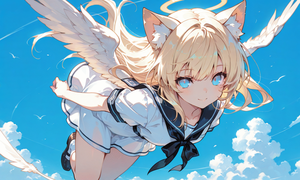 PixAI【Shiitake-Mix】1girl, solo, blonde hair, long hair, straight hair, cat ears, looking at viewer, full body, halo, little wings, flying air, blue sky, cloud, masterpiece, simple background, blue background, high quality, sailor dress, short sleeves, high resolution, tokiame, hyper-detailed, high contrast, depth of field, ray tracing, best lighting, cinematic composition, beautiful face, beautiful eyes, sharp focus, (masterpiece:1.2), (best quality:1.2), (very aesthetic:1.2), (absurdres:1.2), (detailed background), tokiame, hyper-detailed, high contrast, depth of field, ray tracing, best lighting, cinematic composition, beautiful face, beautiful eyes, sharp focus, (masterpiece:1.2), (best quality:1.2), (very aesthetic:1.2), (absurdres:1.2), (detailed background)