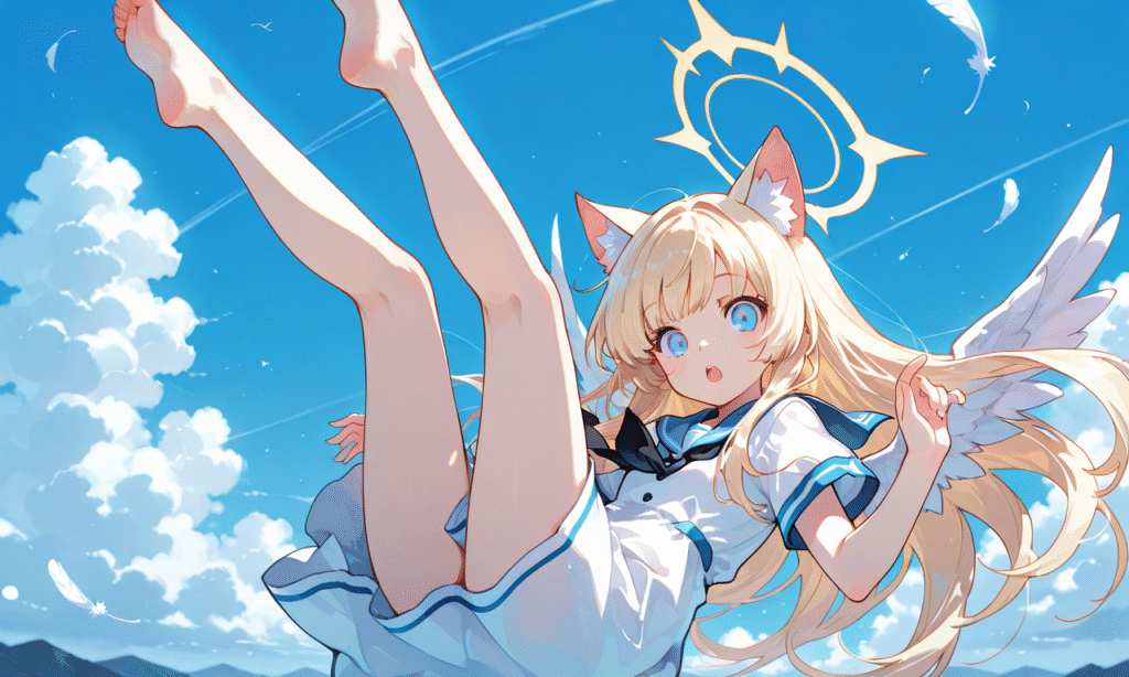 PixAI【Shiitake-Mix】1girl, solo, blonde hair, long hair, straight hair, cat ears, looking at viewer, full body, halo, little wings, falling air, blue sky, legs over head, surprised, open mouth, outstretched arms, masterpiece, high quality, sailor dress, short sleeves, high resolution, hyper-detailed, high contrast, depth of field, ray tracing, best lighting, cinematic composition, beautiful face, beautiful eyes, sharp focus, (masterpiece:1.2), (best quality:1.2), (very aesthetic:1.2), (absurdres:1.2), (detailed background), tokiame