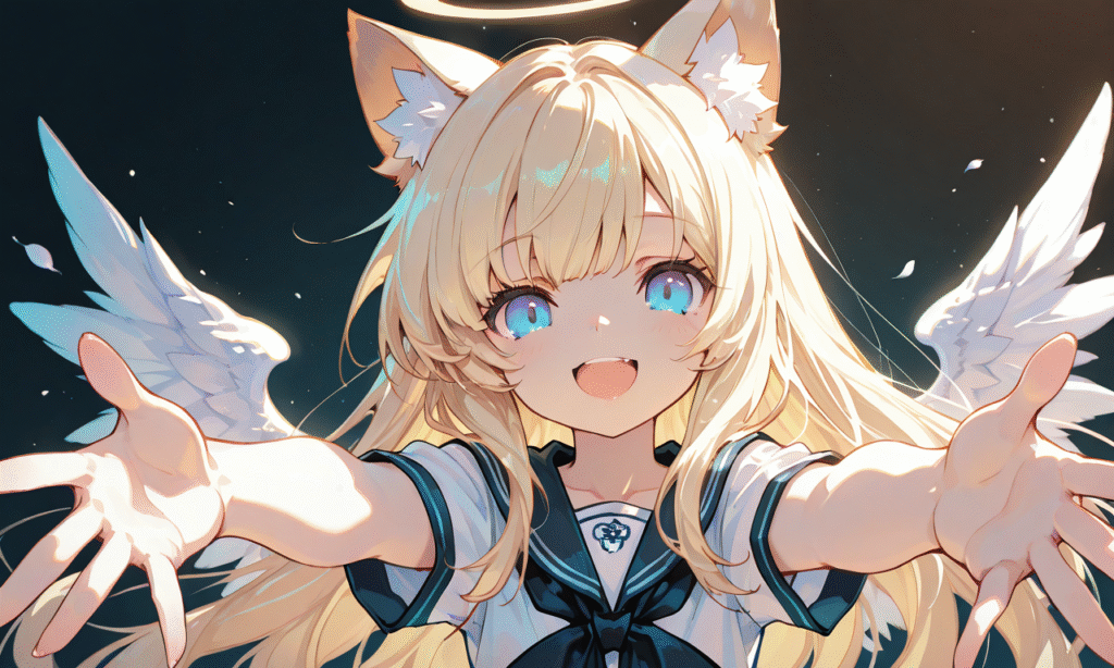 1girl, solo, blonde hair, long hair, straight hair, blue eyes, cat ears, looking at viewer, halo, little wings, outstretched hands, smile, open mouth, happy, simple background, masterpiece, high quality, sailor dress, short sleeves, high resolution, hyper-detailed, high contrast, depth of field, ray tracing, best lighting, cinematic composition, beautiful face, beautiful eyes, sharp focus, (masterpiece:1.2), (best quality:1.2), (very aesthetic:1.2), (absurdres:1.2), (detailed background), tokiame