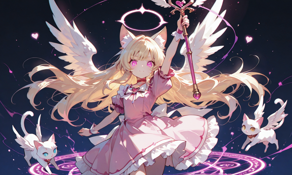 1girl, blonde hair, long hair, cat ears, looking at viewer, cowboy shot, halo, little wings, holding heartstick, long stick, arm up, magical girl, pink dress, magic circle, Glowing Cat(animal), 3 cats, masterpiece, simple background, heart background, high quality, high resolution, tokiame, hyper-detailed, high contrast, depth of field, ray tracing, best lighting, cinematic composition, beautiful face, beautiful eyes, sharp focus, (masterpiece:1.2), (best quality:1.2), (very aesthetic:1.2), (absurdres:1.2), (detailed background), Fantasy Scene