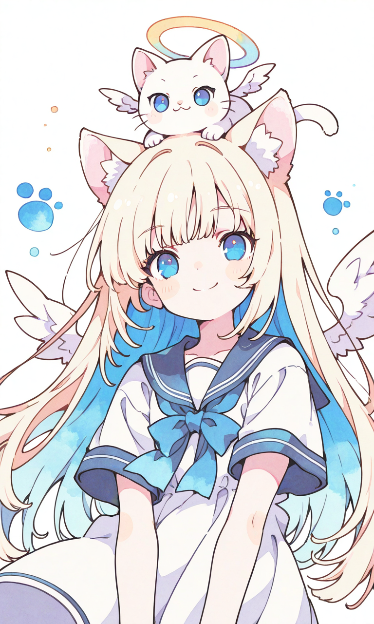 PixAI【Shiitake-Mix】1girl,solo,blonde hair, long hair,straight hair, blue eyes, cat ears, halo, little wings,cat on head, upper body, smile, masterpiece,