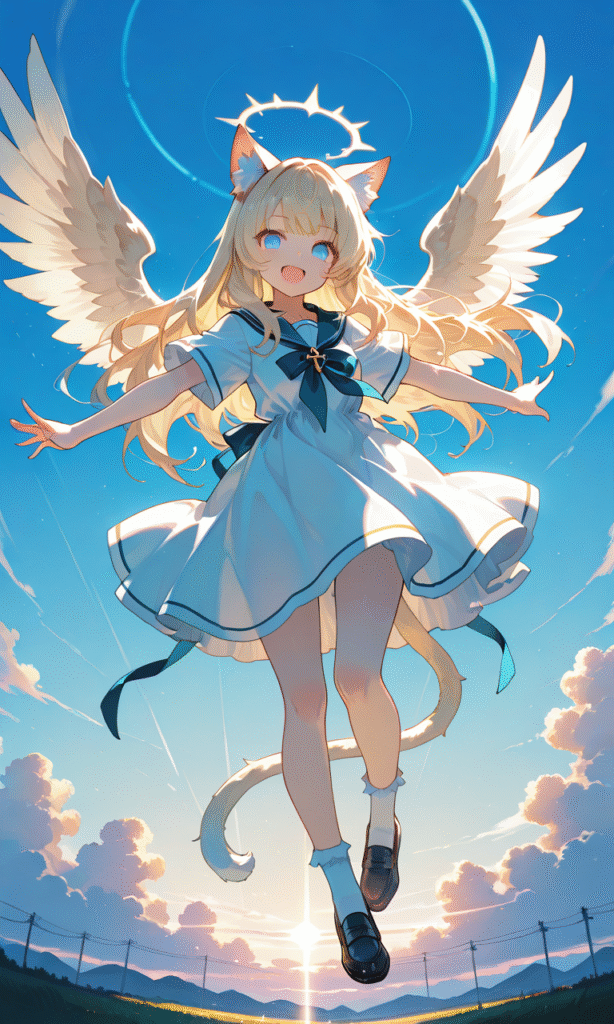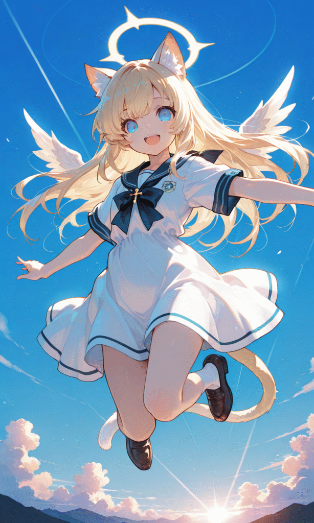 1girl,solo, blonde hair, long hair,straight hair, blue eyes, cat ears,cat Tail, halo, little wings, open mouth,smile,spread arms, looking at viewer,full body,white socks, loafers, blue sky,((beam of light)),flying ((upper air)),((high-altitude sky)),floating air,from below, ((jumping)),knee to chest, masterpiece, high quality, sailor dress, short sleeves,high resolution,hyper-detailed, high contrast, depth of field,Shining Clouds,alpenglow, ray tracing, best lighting, cinematic composition, beautiful face, beautiful eyes, sharp focus, (masterpiece:1.2), (best quality:1.2), (very aesthetic:1.2), (absurdres:1.2), (detailed background),hyper-detailed, high contrast, depth of field, ray tracing, best lighting, cinematic composition, beautiful face, beautiful eyes, sharp focus, (masterpiece:1.2), (best quality:1.2), (very aesthetic:1.2), (absurdres:1.2), (detailed background),tokiame,hyper-detailed, high contrast, depth of field, ray tracing, best lighting, cinematic composition, beautiful face, beautiful eyes, sharp focus, (masterpiece:1.2), (best quality:1.2), (very aesthetic:1.2), (absurdres:1.2), (detailed background),cinematic lighting , cinematic angle, soft light , color detail, backlighting, Depth of field, long exposure, light steps, intricate colors, vibrant colors,