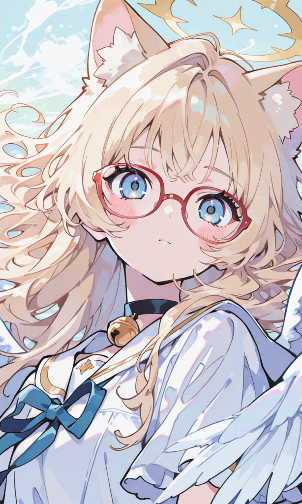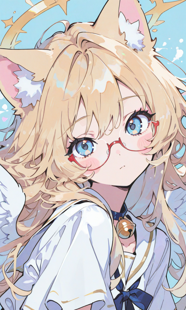 PixAI【Shiitake-Mix】cute chibi nekomimi little girl, long blonde hair, flowing hair, big blue eyes,gem-like eyes, cat ears, fluffy cat tail, golden halo above head,red ((glasses)),upper body, small cute angel wings on back, white sailor dress, short sleeves, neck bell, ribbon, smugness,blush stickers