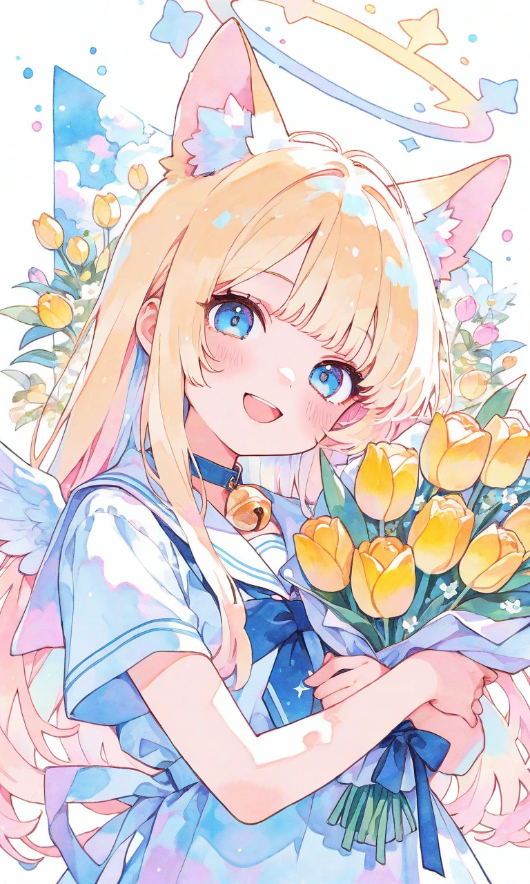 PixAI【Shiitake-Mix】litre girl,((solo)),blonde hair,long hair,cat ears,blue eyes,looking at viewer,halo, little wings, sailor dress, short sleeves,neck bell, smile,open mouth, upper body, holding bouquet,wrapping,tulip, high-res,Simple coloring, limited color palette, grainy texture, color contrast, complementary colors, defined shading,watercolor, sketch style, watercolor effect, pastel colors