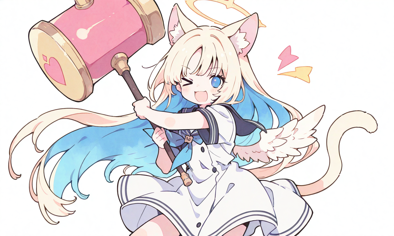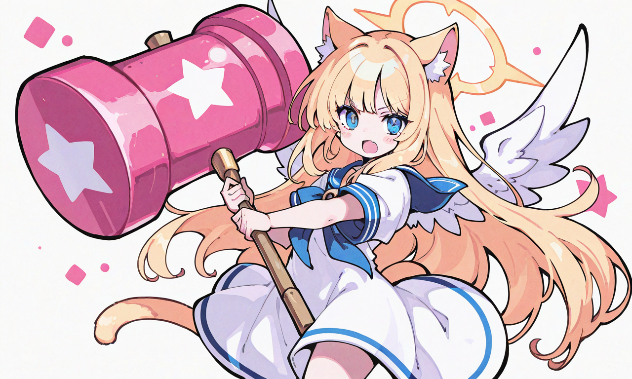 PixAI【Shiitake-Mix】1girl,solo, blonde hair, long hair,straight hair, blue eyes,cat ears,cat Tail, halo, little wings, >o<,sailor dress, short sleeves,holding big hammer,pink hammer(heart-shaped), looking at viewer,incoming attack,cowboy shot,simplebackground,white background, masterpiece,high quality,high resolution