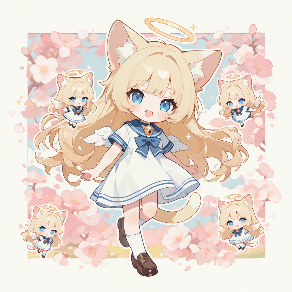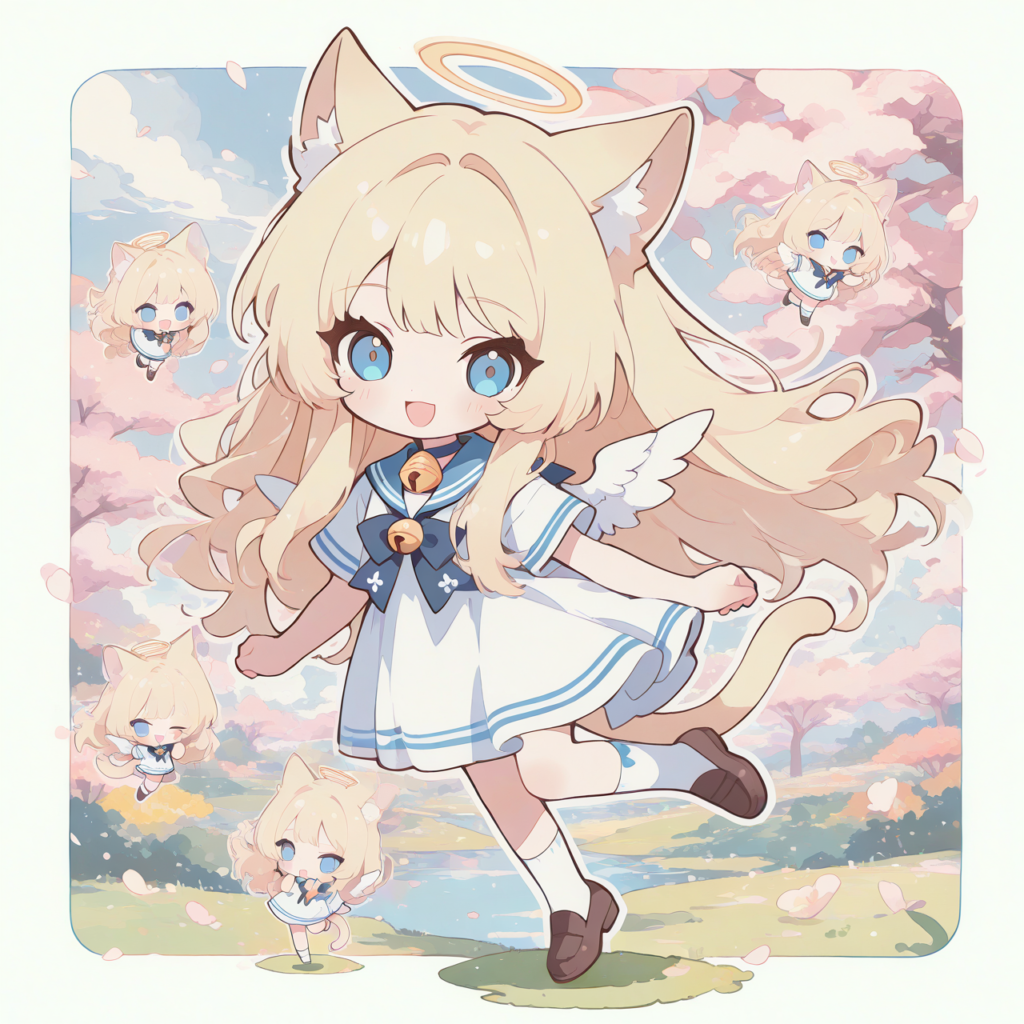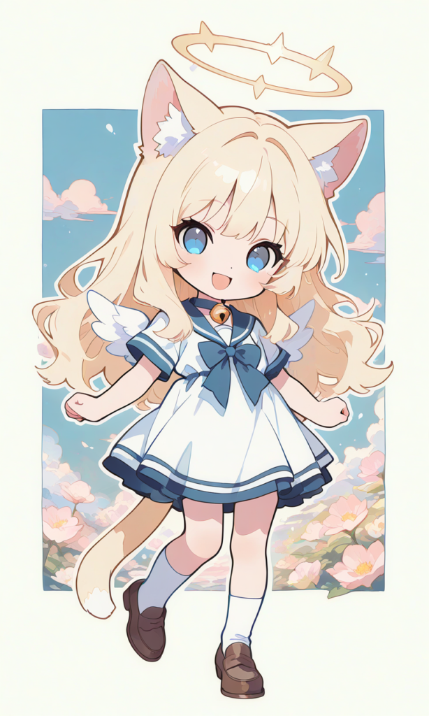 PixAI【Shiitake-Mix】((chibi)), 1girl, (((solo))), blonde hair, long hair, cat ears, cat tail, blue eyes, looking at viewer, smile, open mouth, halo, little wings, sailor dress, short sleeves, neck bell, white socks, loafers, skipping, spring (season), minimalism, high-res, fantasy scene, masterpiece, highest quality, white outline