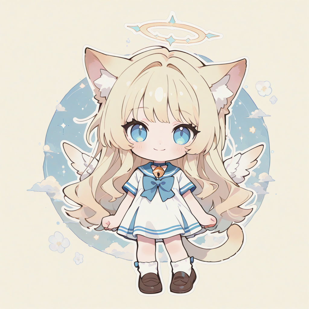 1girl, chibi, solo, blonde hair, long hair, cat ears, cat tail, blue eyes, looking at viewer, halo, little wings, sailor dress, short sleeves, neck bell, smile, white socks, loafers, standing, simple background, high-res, fantasy scene, masterpiece, highest quality, white outline, chibi style anime illustration, deformed, best quality, illustration, thick outline, outlined vector graphics, 2d cel anime, flat color style, simple coloring style, only one person depicted, big eyes, short limbs