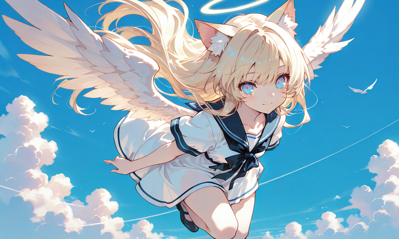 PixAI【Shiitake-Mix】1girl, solo, blonde hair, long hair, straight hair, cat ears, looking at viewer, full body, halo, little wings, flying air, blue sky, cloud, masterpiece, simple background, blue background, high quality, sailor dress, short sleeves, high resolution, tokiame, hyper-detailed, high contrast, depth of field, ray tracing, best lighting, cinematic composition, beautiful face, beautiful eyes, sharp focus, (masterpiece:1.2), (best quality:1.2), (very aesthetic:1.2), (absurdres:1.2), (detailed background), tokiame, hyper-detailed, high contrast, depth of field, ray tracing, best lighting, cinematic composition, beautiful face, beautiful eyes, sharp focus, (masterpiece:1.2), (best quality:1.2), (very aesthetic:1.2), (absurdres:1.2), (detailed background)