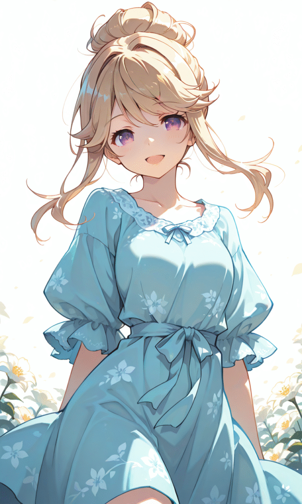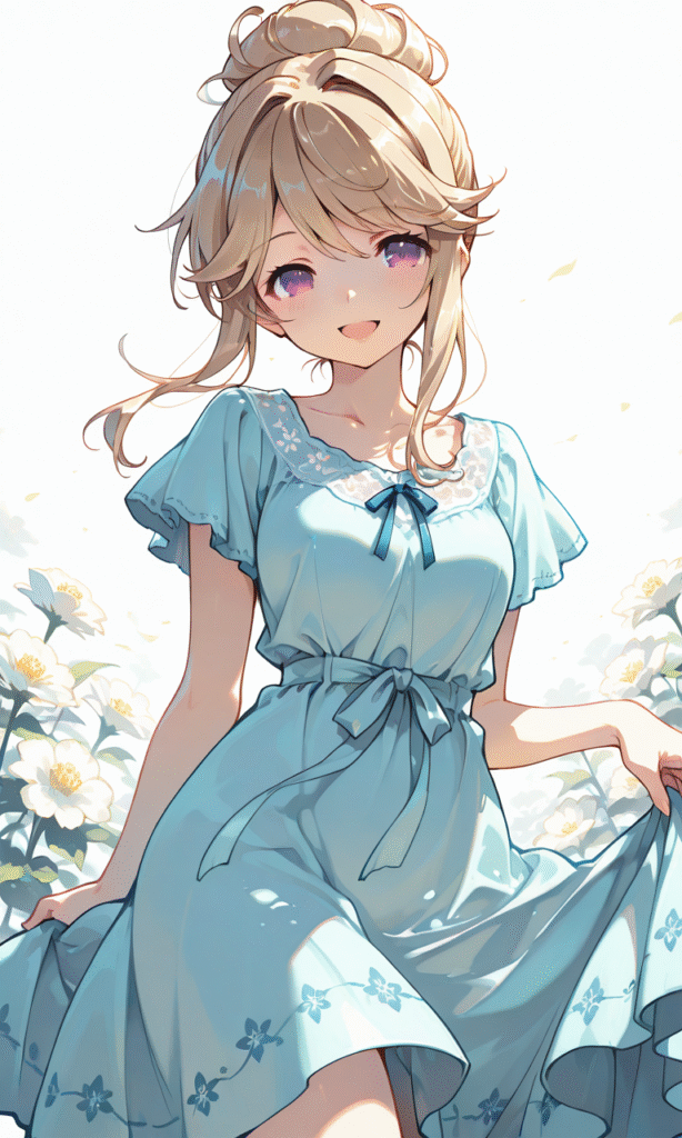 tenkubashi tomoka, light blue dress, flower pattern, smile, open mouth, cowboy shot, simple background, white background, masterpiece, high quality, high resolution, tokiame, hyper-detailed, high contrast, depth of field, ray tracing, best lighting, cinematic composition, beautiful face, beautiful eyes, sharp focus, (masterpiece:1.2), (best quality:1.2), (very aesthetic:1.2), (absurdres:1.2), (detailed background)