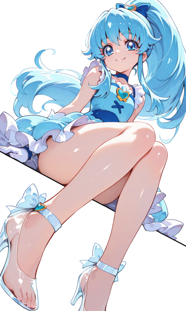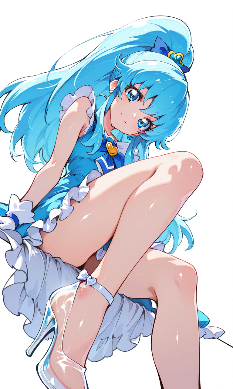 PixAI【Shiitake-Mix】shirayuki hime(precure),ponytail,smile,white frilled dress,sleeveless,white gloves,transparent high heels,sitting,from below, cowboy shot,simplebackground,white background, masterpiece,high quality, ,tokiame,shiny skin, shiny