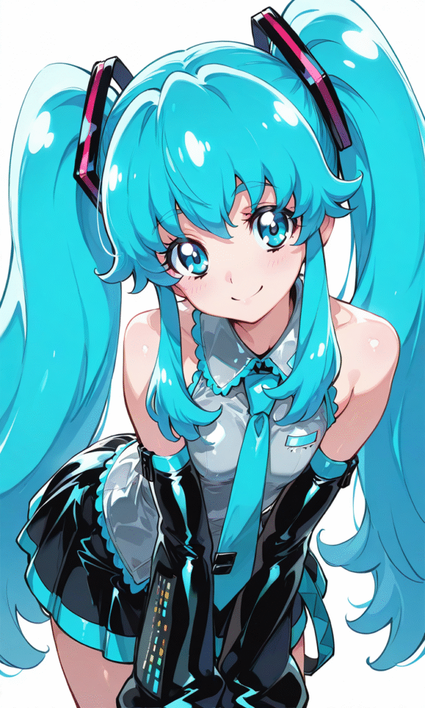 shirayuki hime(precure),twintail,hatsune miku (cosplay), smile,leaning forward,cowboy shotsimplebackground,white background, masterpiece,high quality,shiny skin, shiny,tokiame