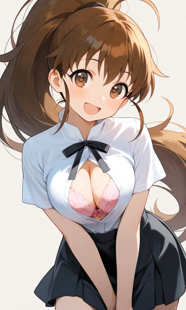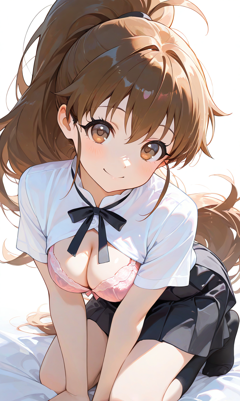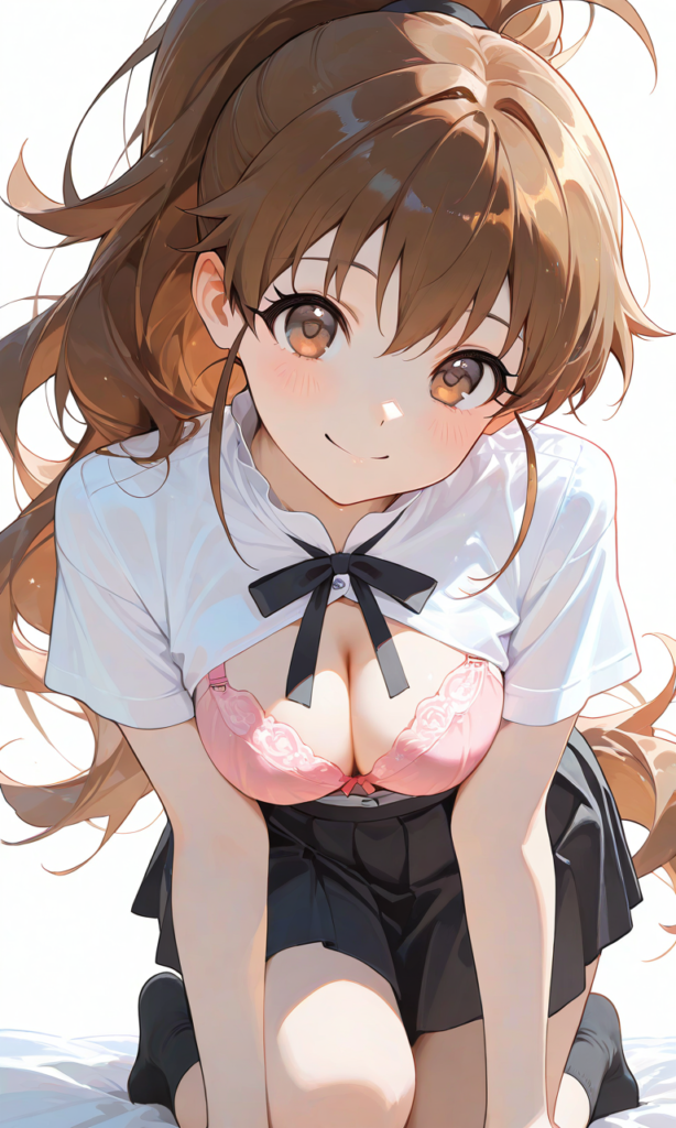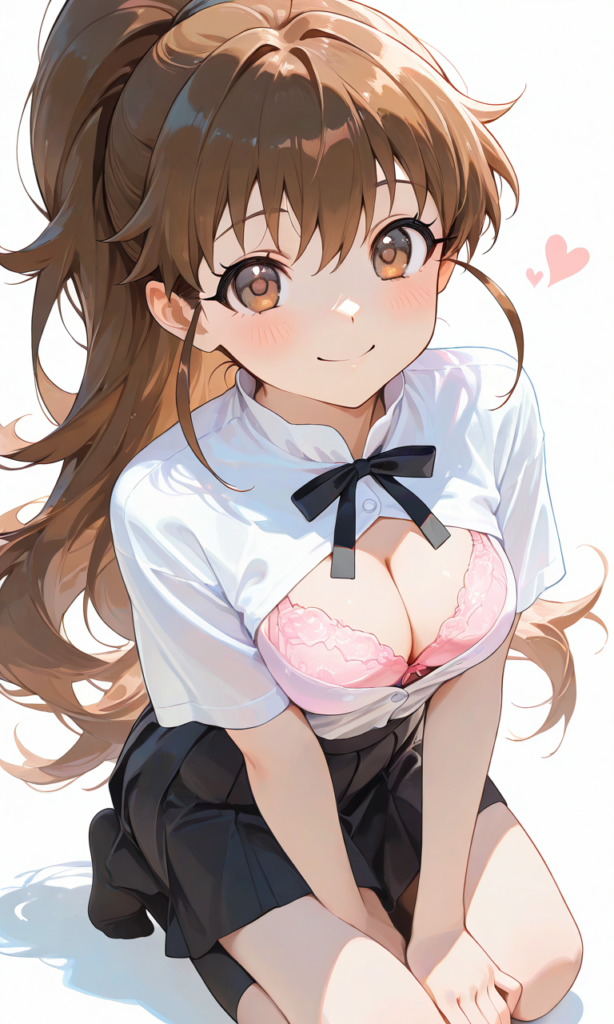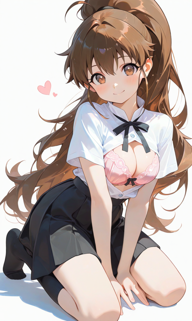 PixAI【Shiitake-Mix】taneshima popura,dress shirt,short sleeves, neck ribbon,black skirt, cleavage cutout,pink bra,kneeling,full body, smile,looking at viewer,black socks,simple background, white background, masterpiece,high resolution,high quality, ,high-res,♡masterpiece, highest quality, ♡