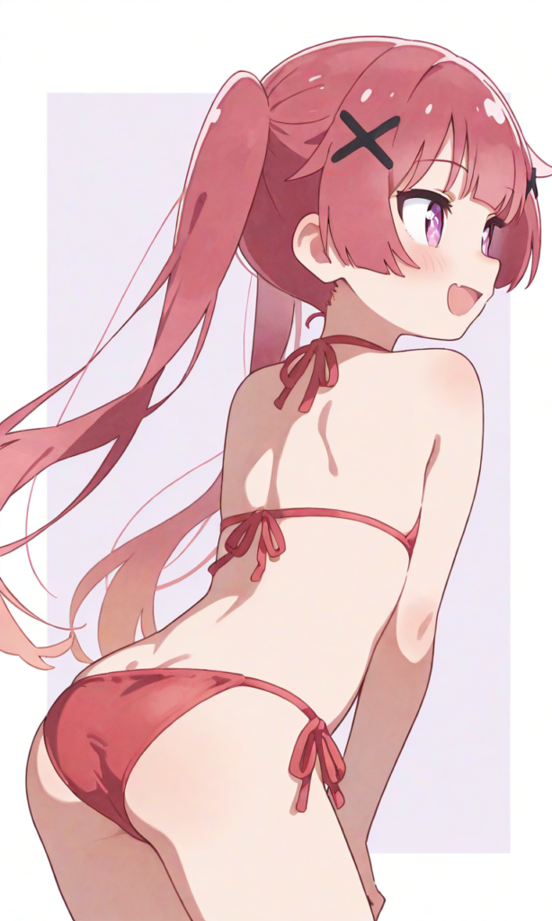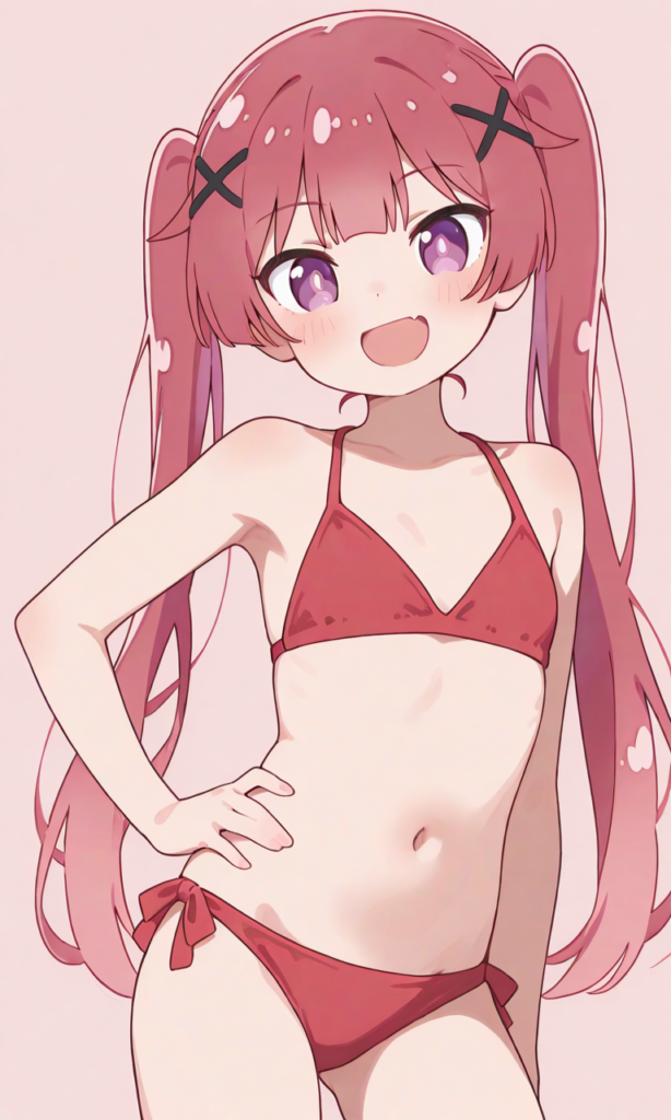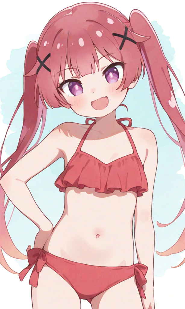 PixAI【Shiitake-Mix】tanemura koyori, loli,smile,open mouth, micro bikini,red bikini,looking back, cowboy shot,masterpiece,high resolution,high quality, looking at viewer, ,high-res,tanemura koyori, red hair, long hair, twintails, x hair ornaments, pinkish-purple eyes,[Watercolor], soft lines, harmonious color palette