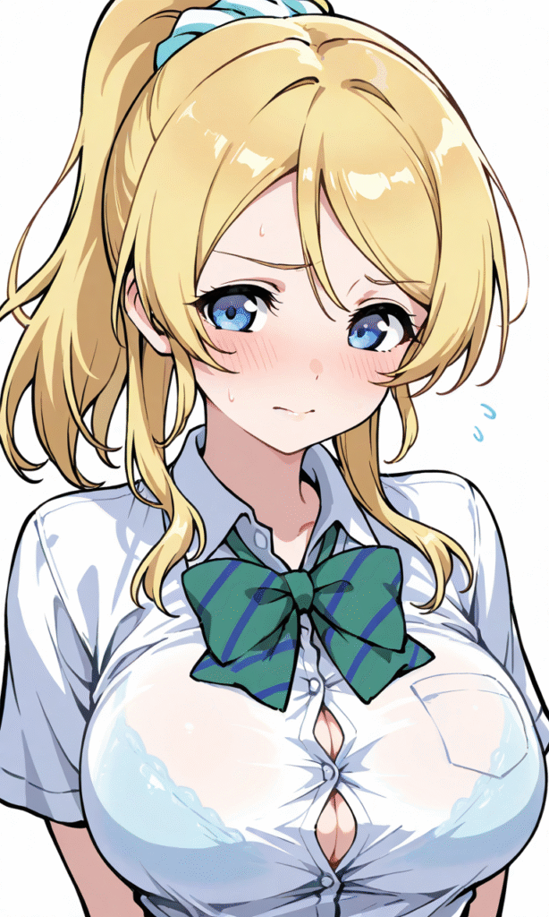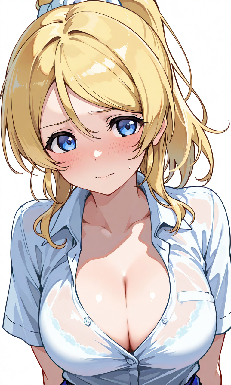 PixAI【Shiitake-Mix】ayase eli, otonokizaka school uniform, short sleeves, cleavage,embarrassed,upper body, simplebackground,white background, masterpiece,high quality, high resolution,tokiame